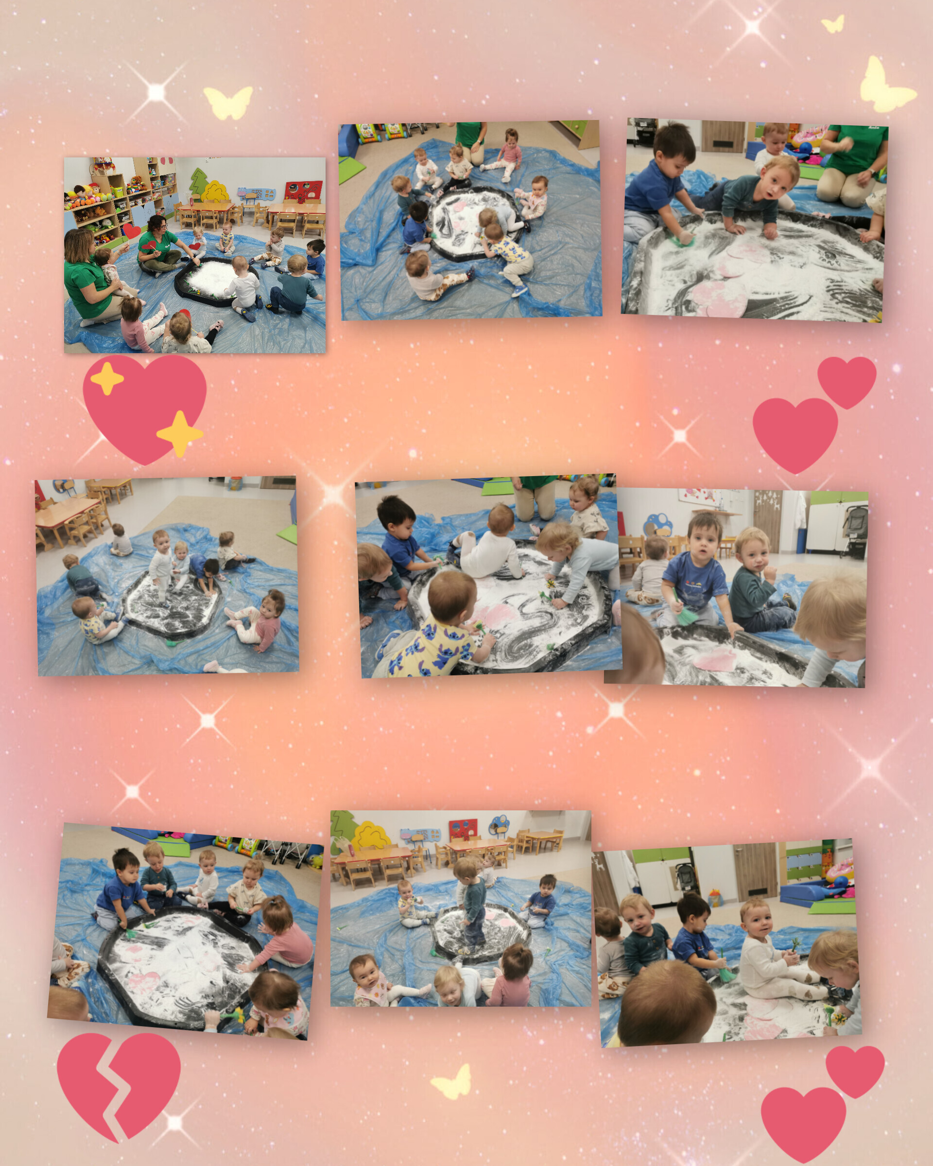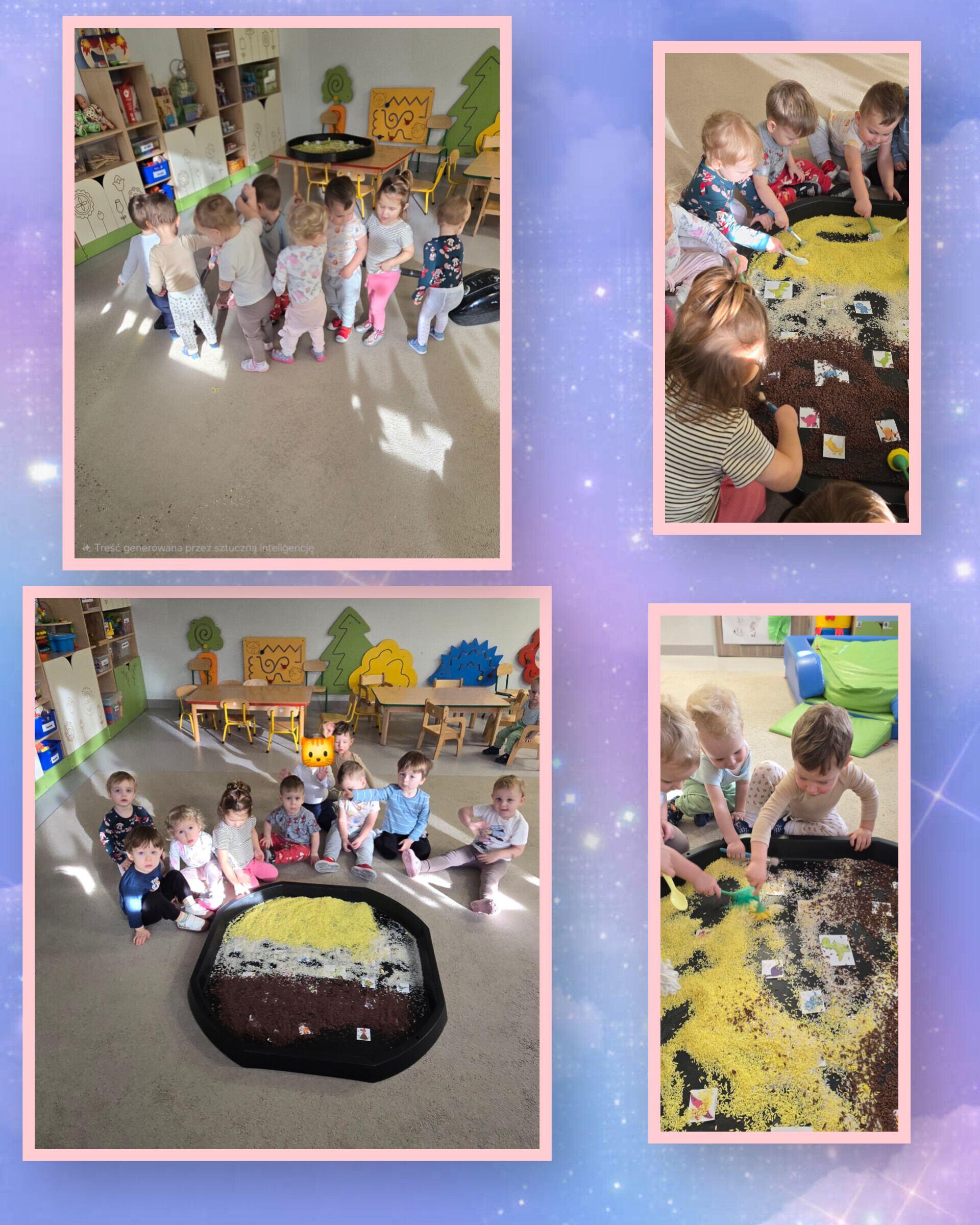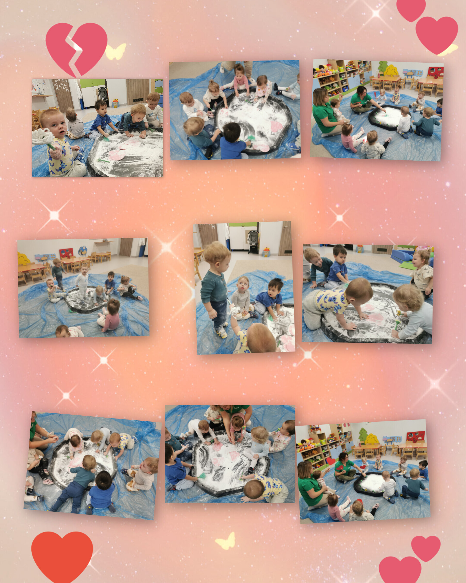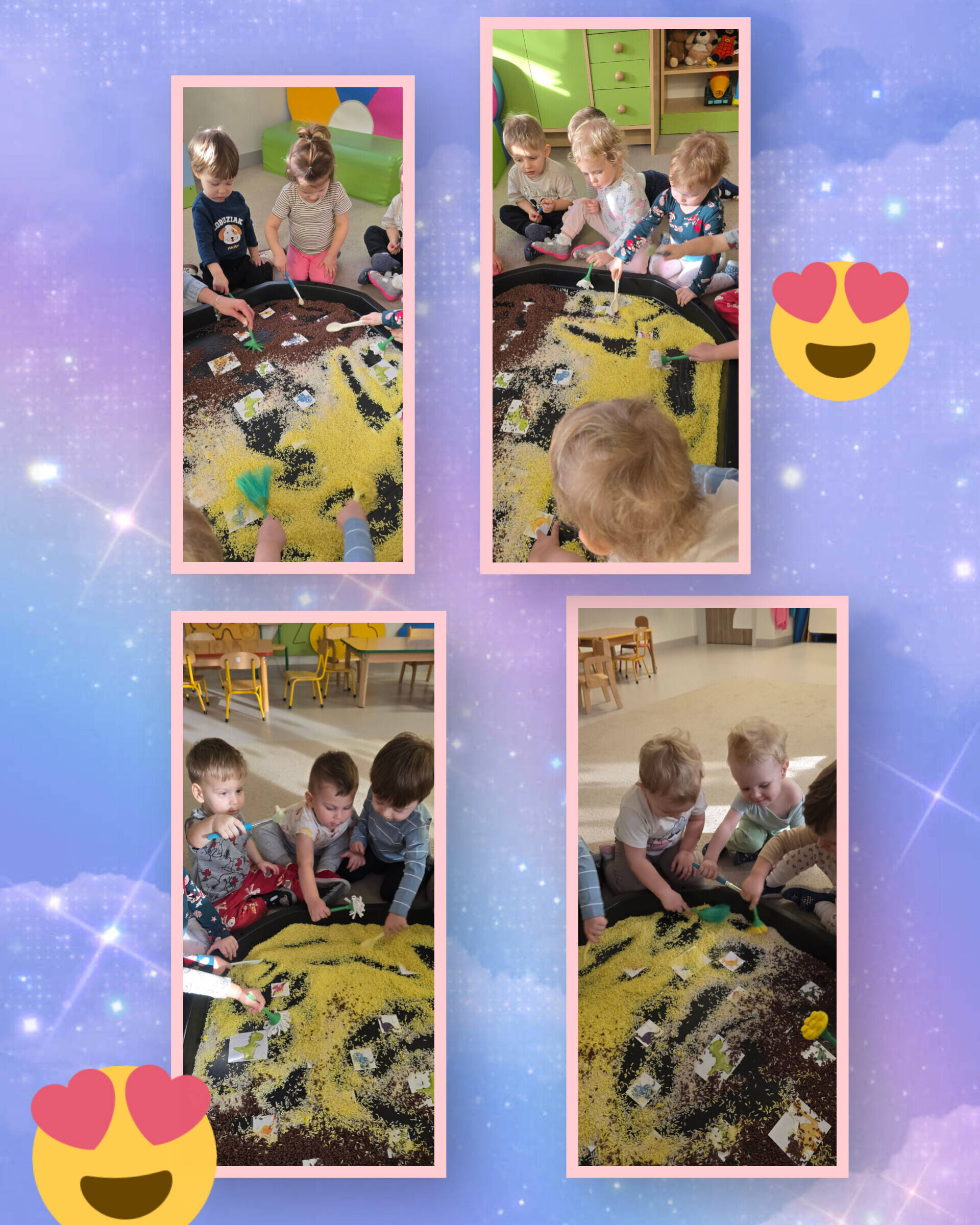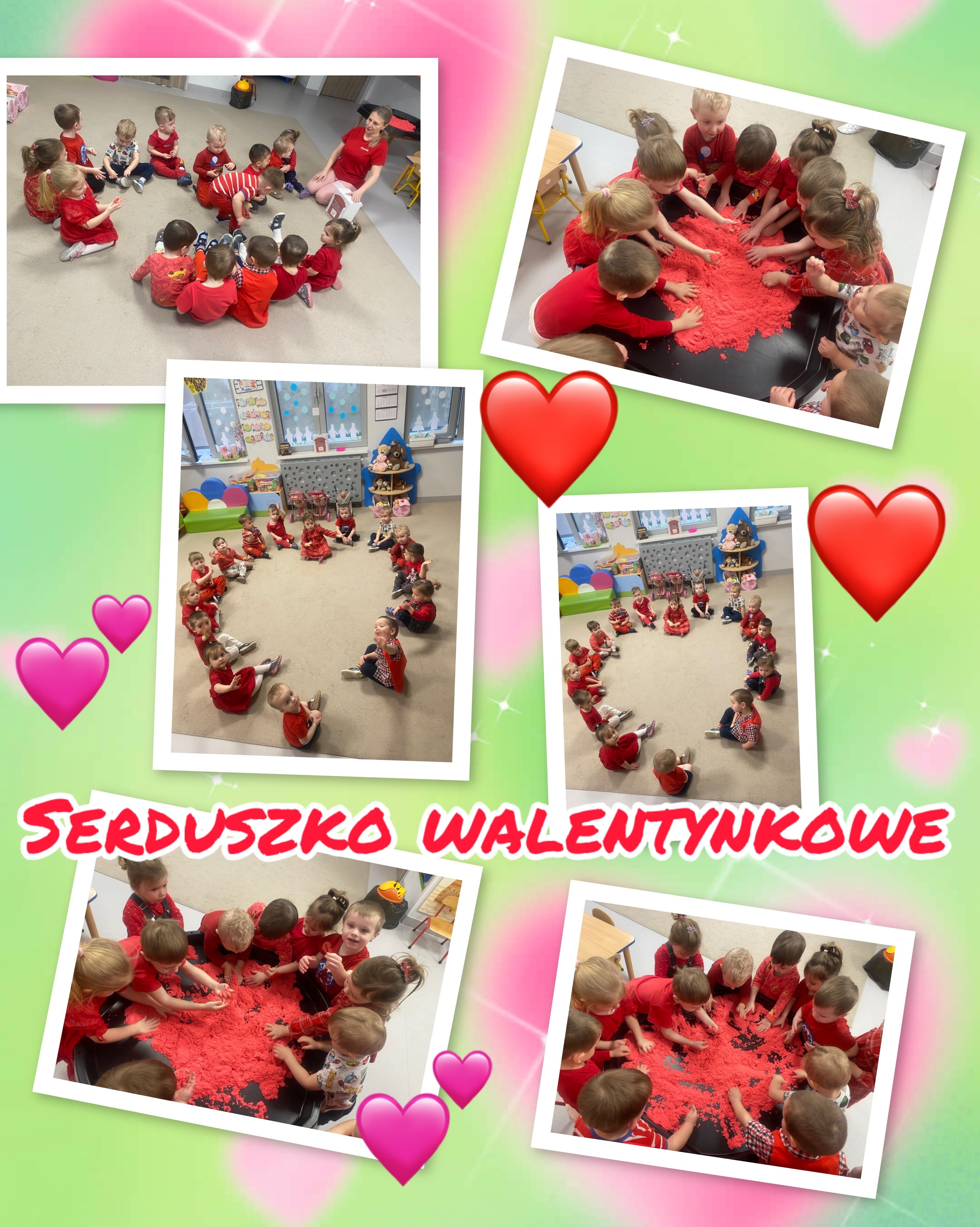 Maluchy z ogromnym zaangażowaniem poszukiwały czerwonych serc ukrytych w mące ziemniaczanej. Zadanie wymagało sprytu, odwagi i gotowości na totalne „zamączone” wyzwania. Mąka – teoretycznie grzecznie wsypana do pojemnika – postanowiła jednak przeżyć własną przygodę i fruwała po całej sali...