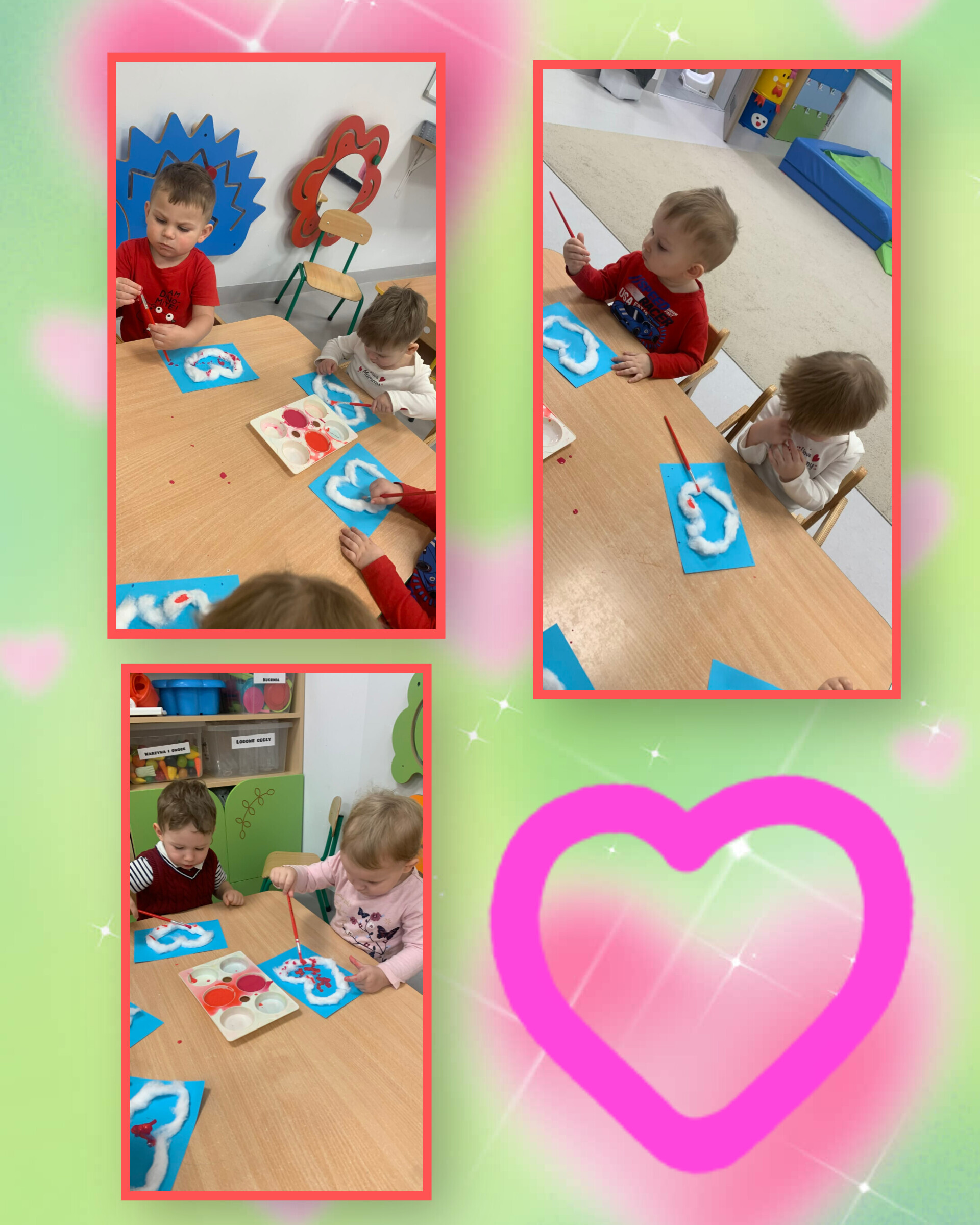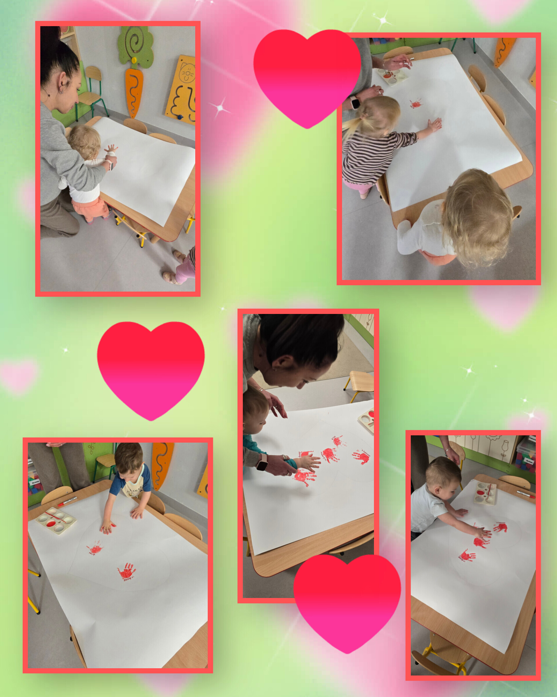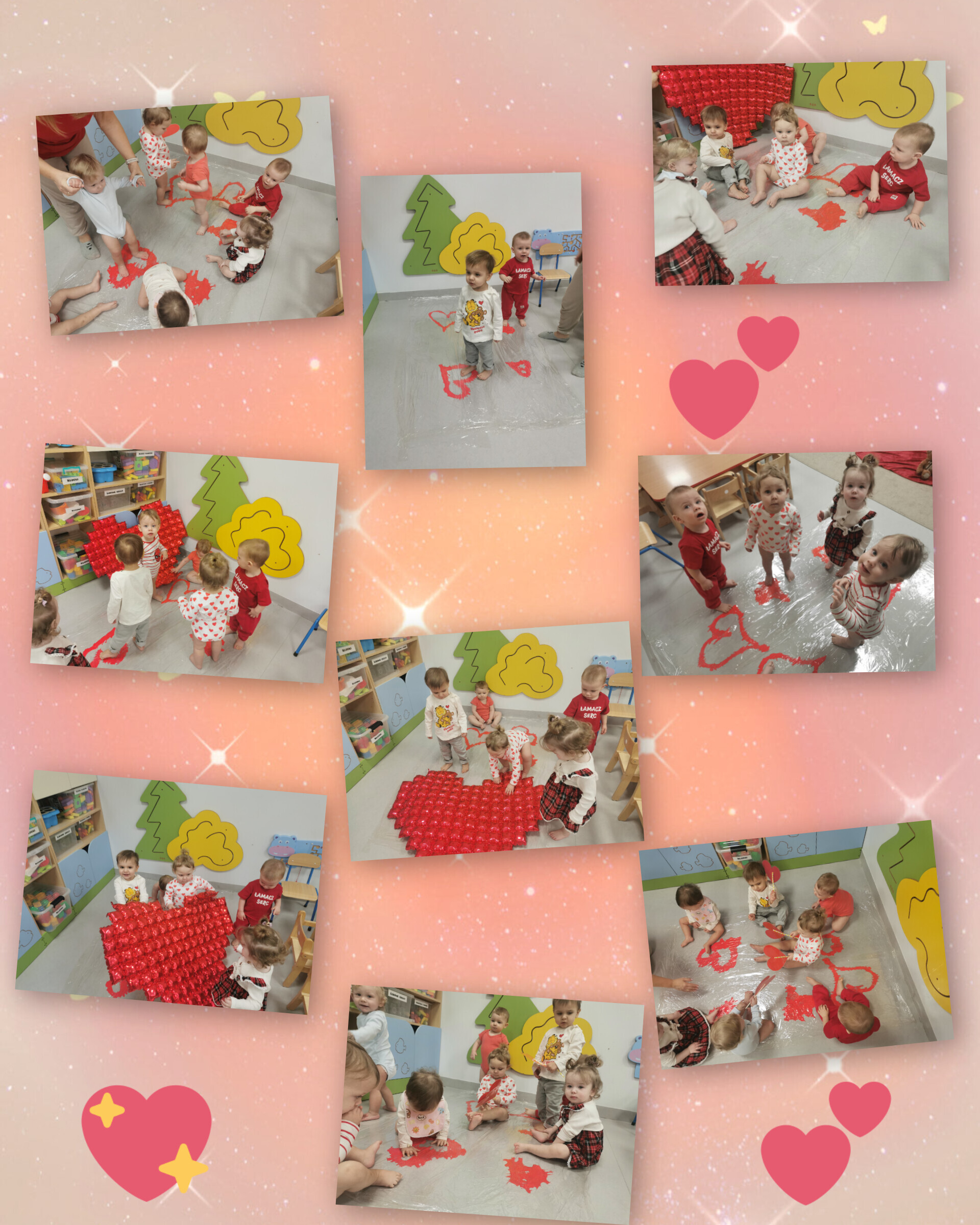 Nasze maluszki nie tylko tworzyły serduszkowe dzieła sztuki, ale też zamieniły się w prawdziwych artystów-deptaczy. Przez folię „rozdeptywały” kontury serc, a spod małych stópek wyłaniały się gorące, czerwone serducha – prosto z miłosnej fabryki!