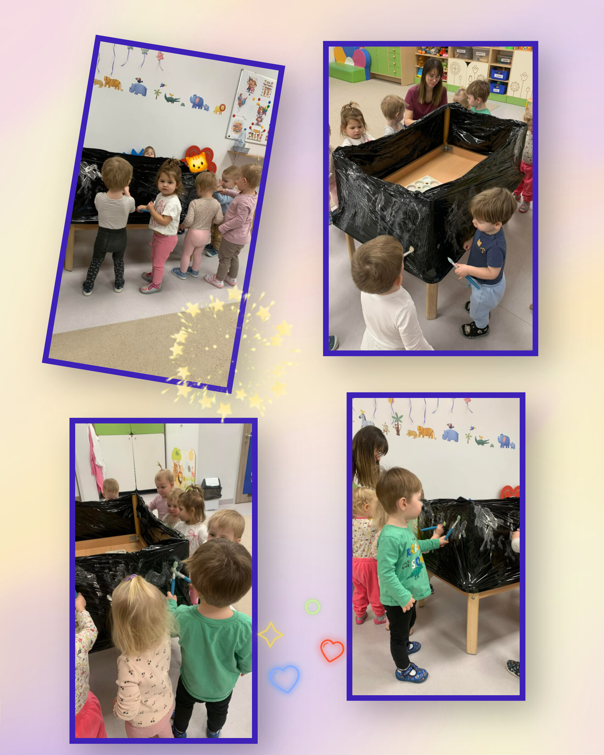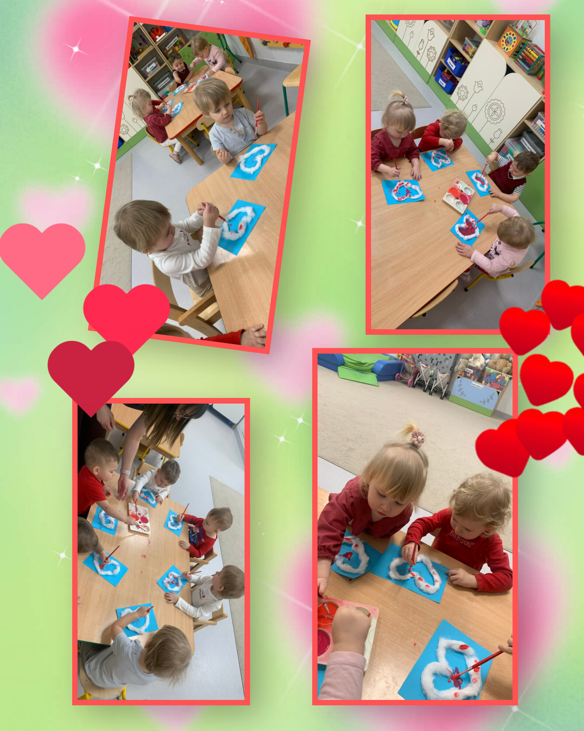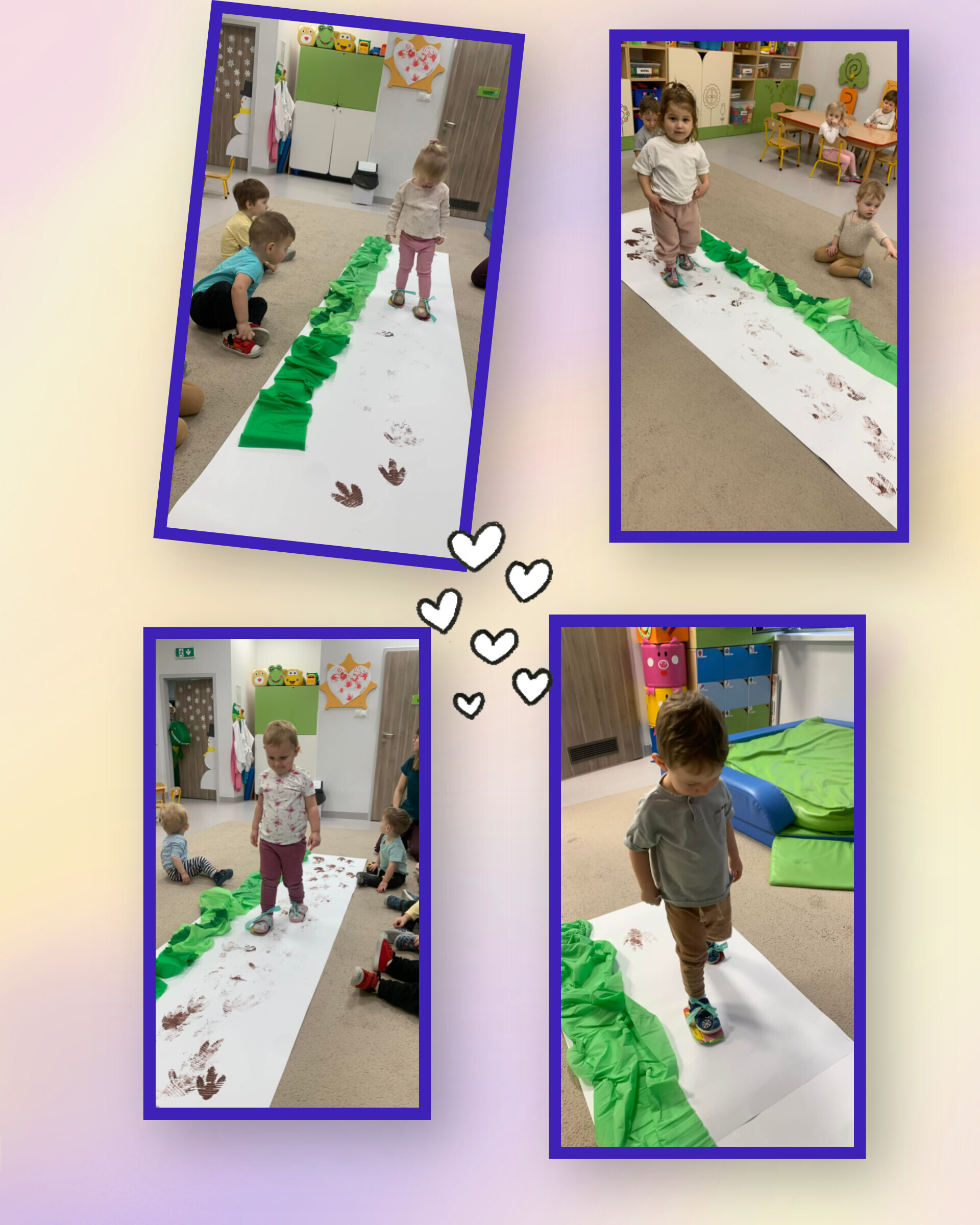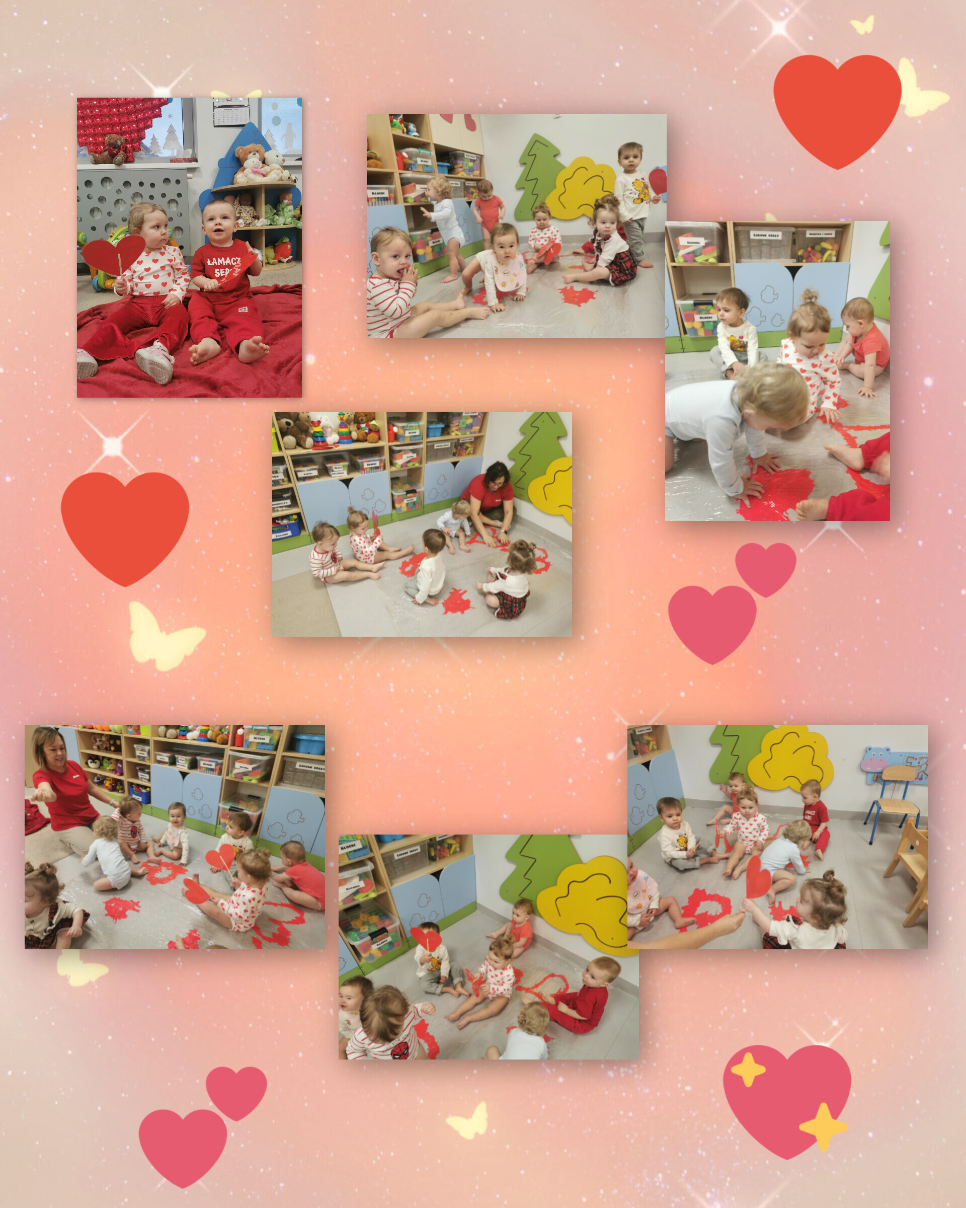 Nasze maluszki nie tylko tworzyły serduszkowe dzieła sztuki, ale też zamieniły się w prawdziwych artystów-deptaczy. Przez folię „rozdeptywały” kontury serc, a spod małych stópek wyłaniały się gorące, czerwone serducha – prosto z miłosnej fabryki!