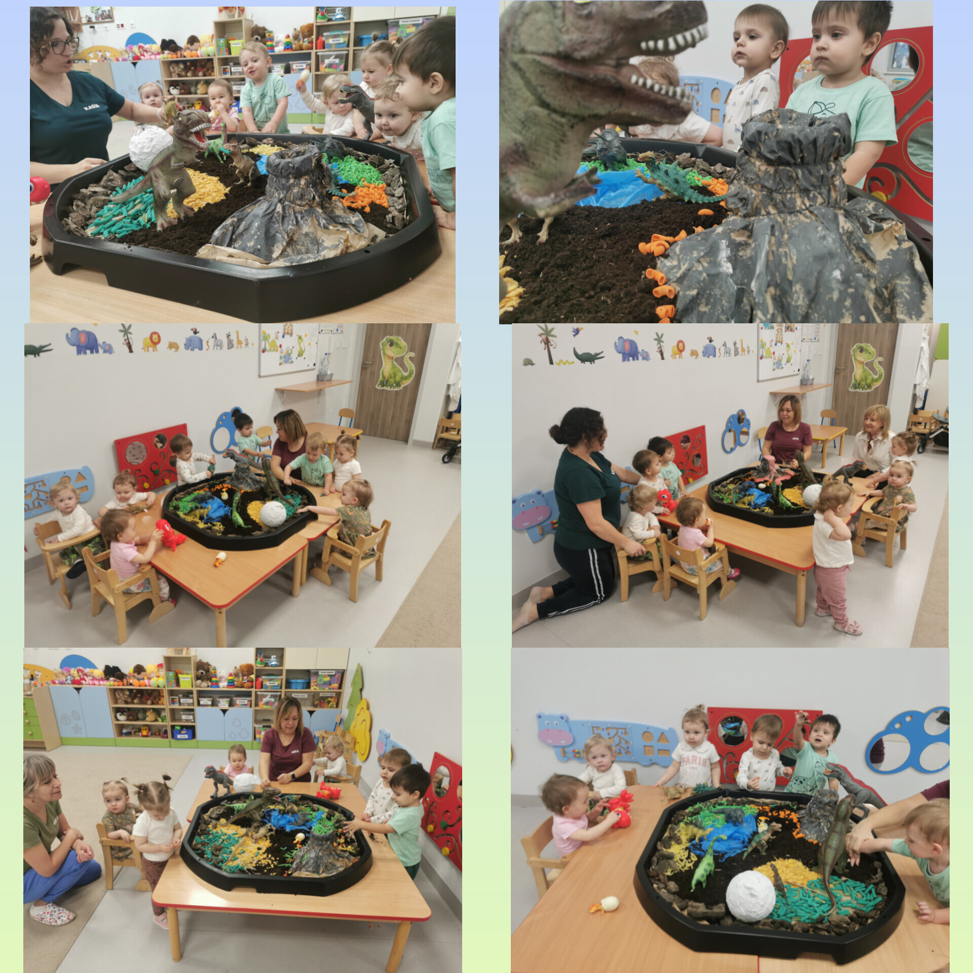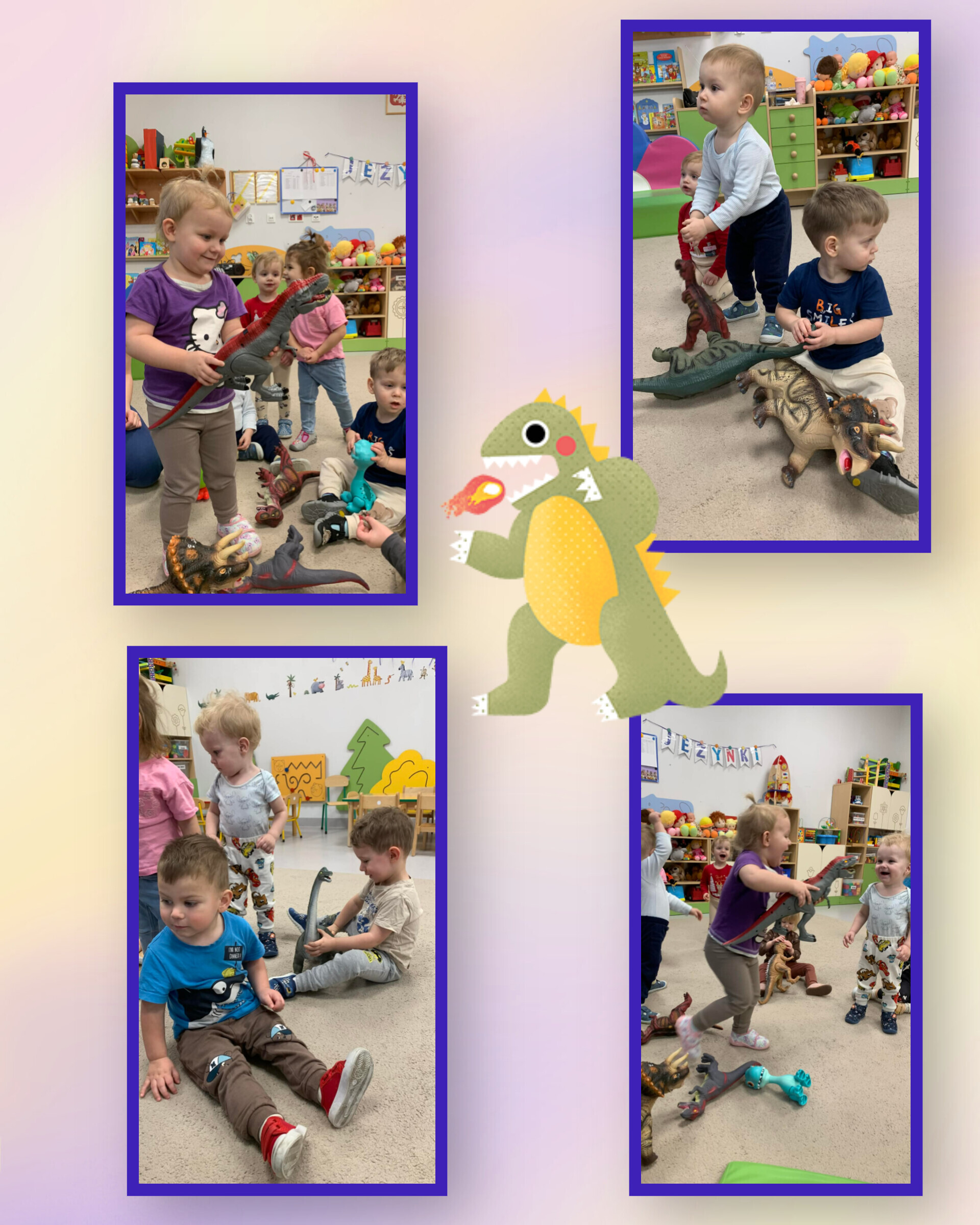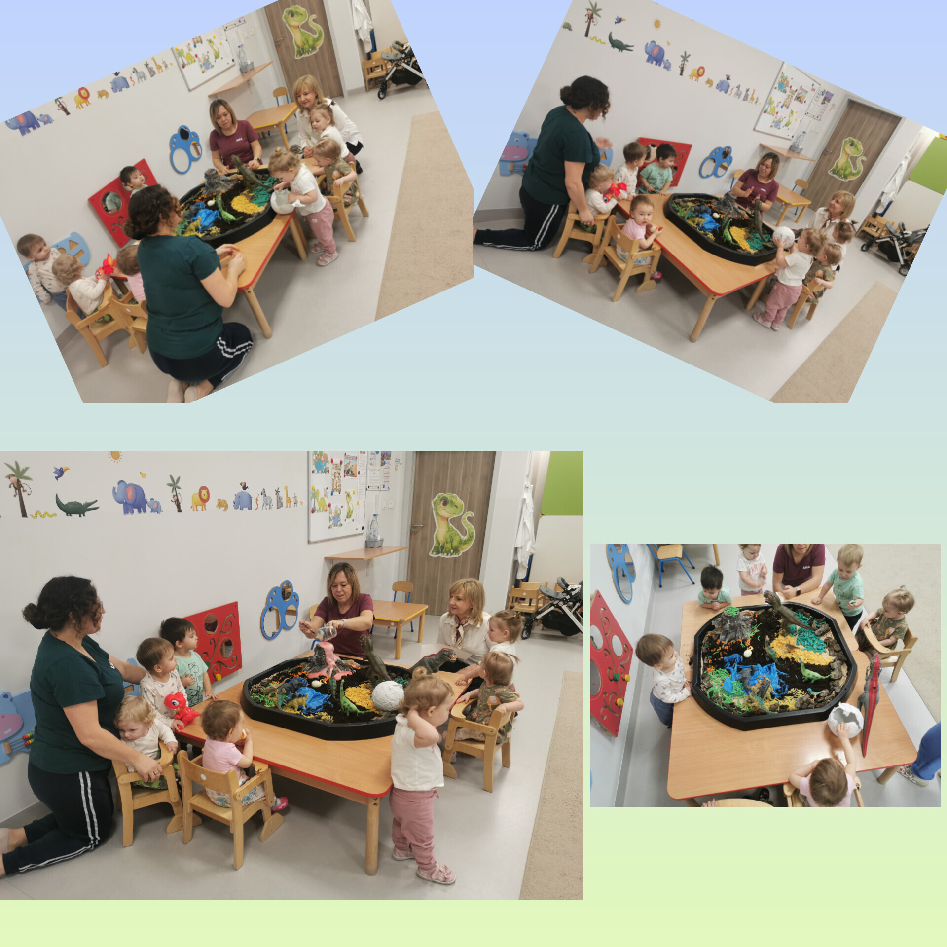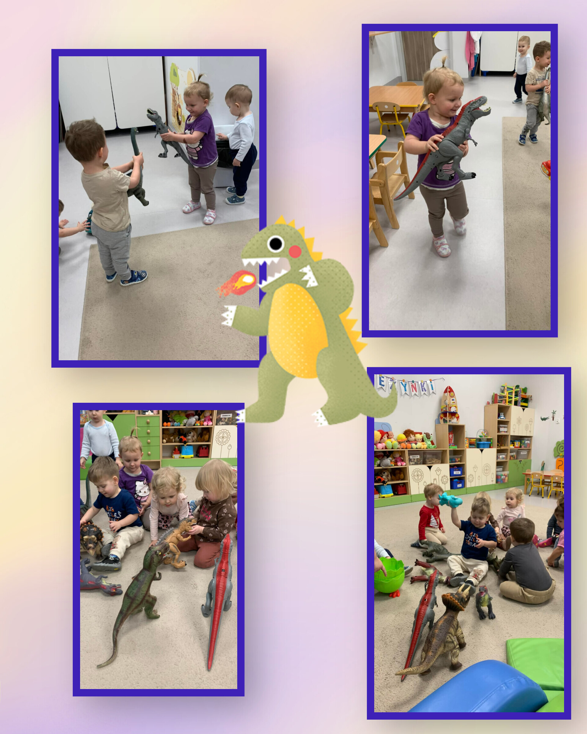 Sale zamieniły się w prehistoryczne krainy, a my przenieśliśmy się miliony lat wstecz. Poznawaliśmy dinozaury – te małe, te duże i te z baaaardzo trudnymi nazwami. Antoś, z pomocą swojego taty, przyniósł do żłobka całą ekipę dinozaurów i nazywał je z taką dumą, jakby znał je osobiście!