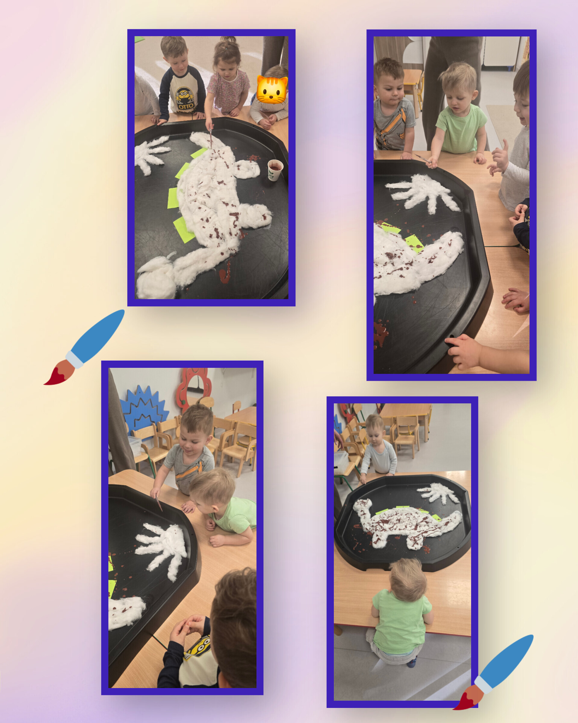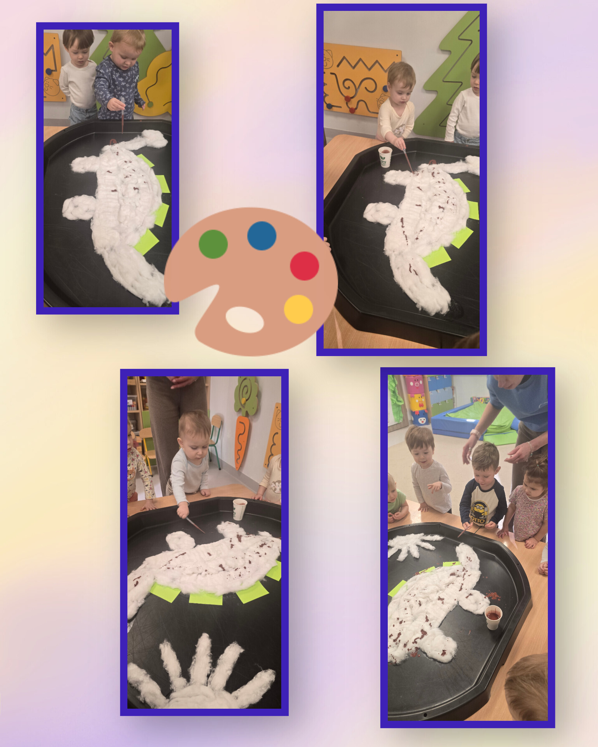 Choć na dworze jest zimno, u nas panuje ciepła i radosna atmosfera. Podczas krótkich spacerów z ciekawością oglądaliśmy biały śnieg i zimowy świat. Zainspirowani zimą postanowiliśmy stworzyć własny zimowy pejzaż. Biała farba zamieniła się w puszysty śnieg, a my – z uśmiechami na twarzach – w małych, radosnych artystów.