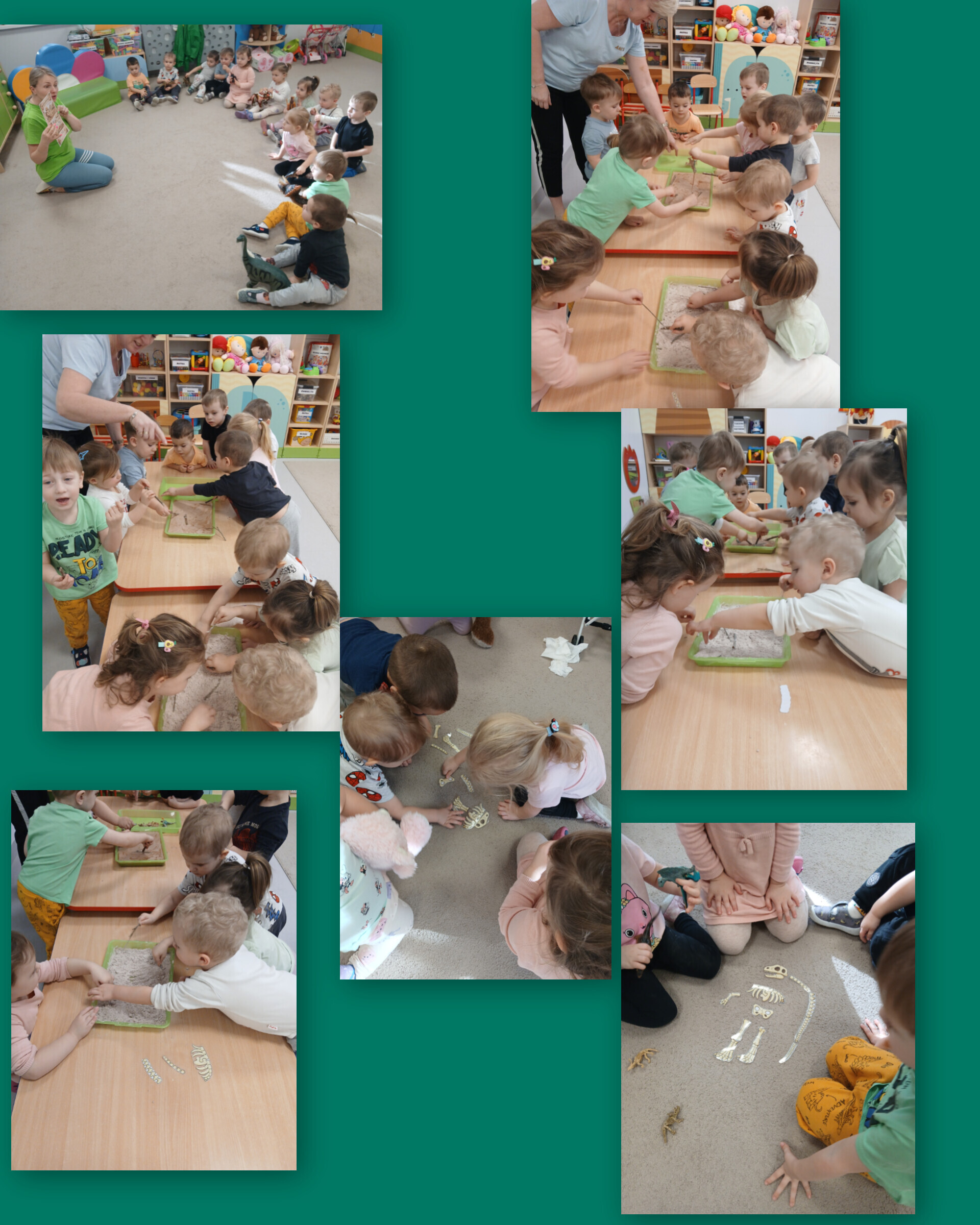 My też staliśmy się dinozaurami! Odbijaliśmy łapy, chodziliśmy po śladach wielkiego gada, farbami ozdabialiśmy jego sylwetę, a nawet składaliśmy szkielet jak prawdziwi paleontolodzy. W kuwecie z ryżem szukaliśmy szczątków – cierpliwie i z ogromnym zaangażowaniem.