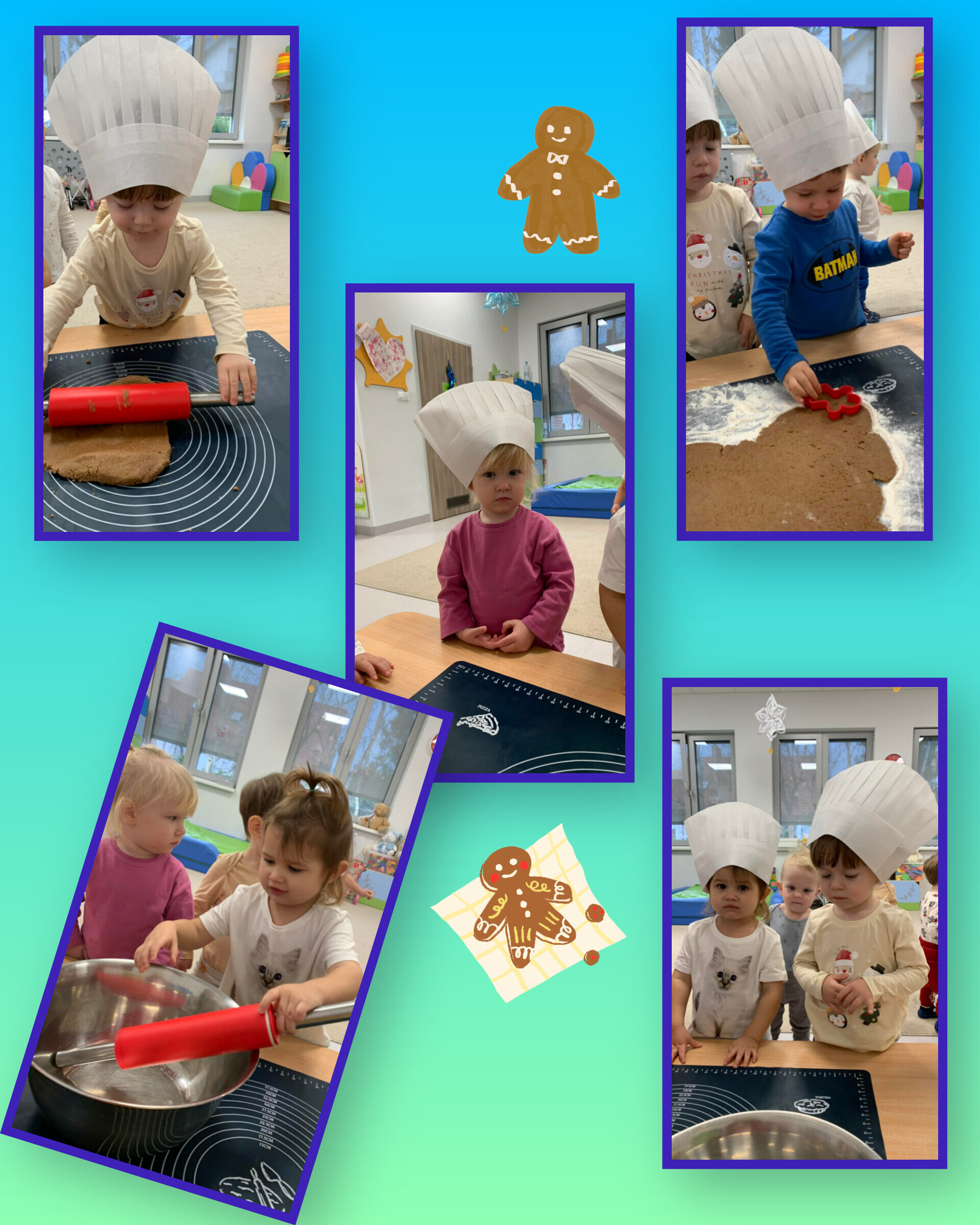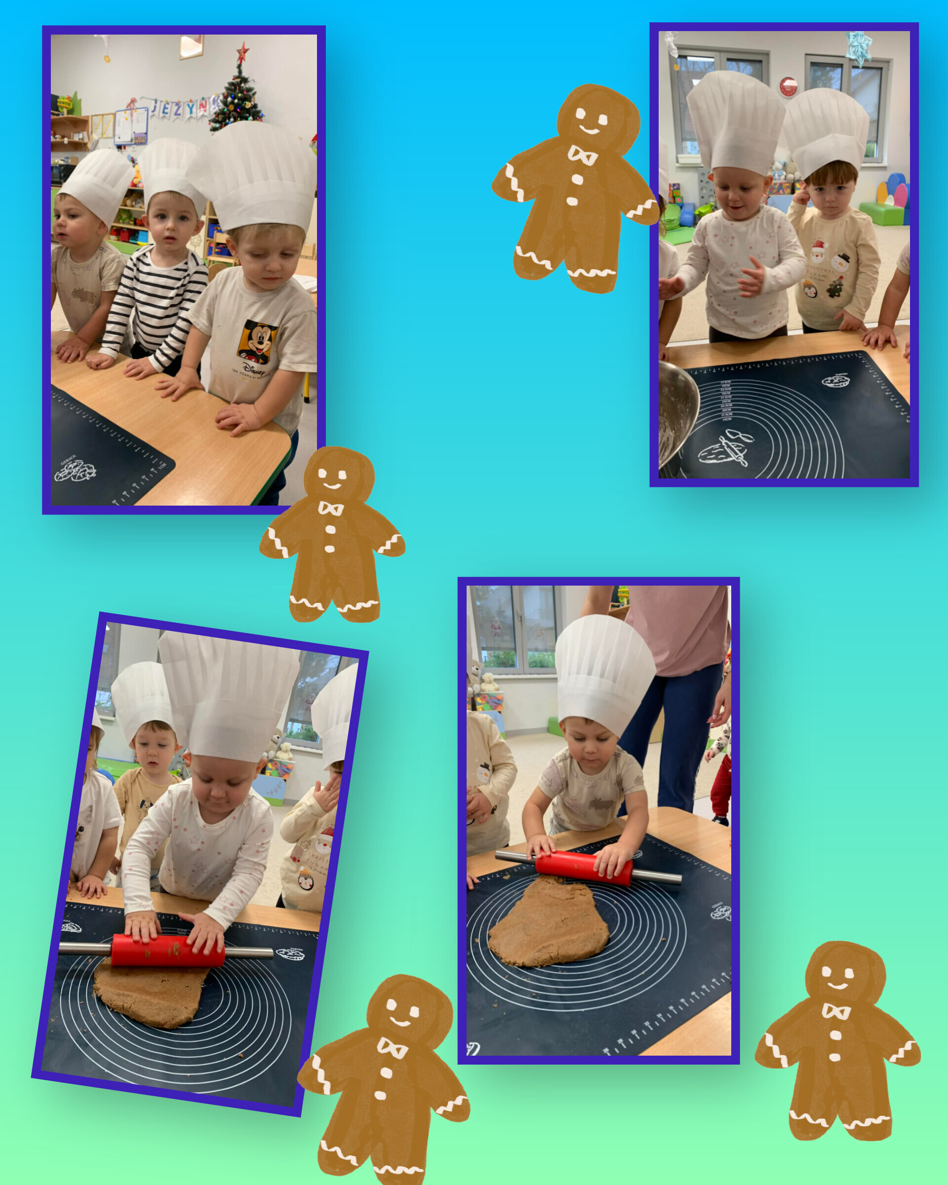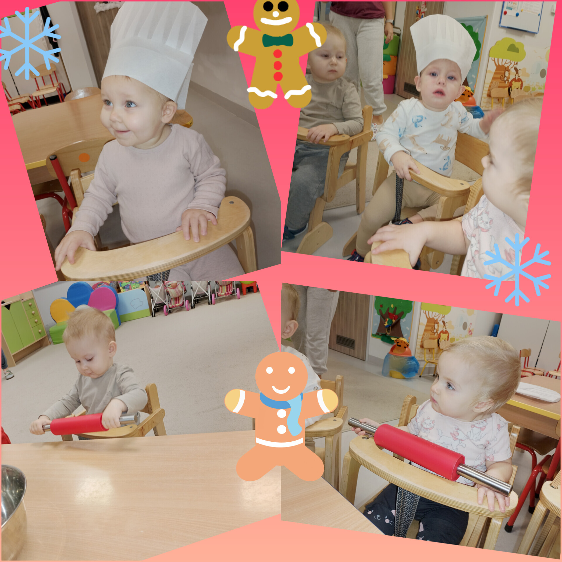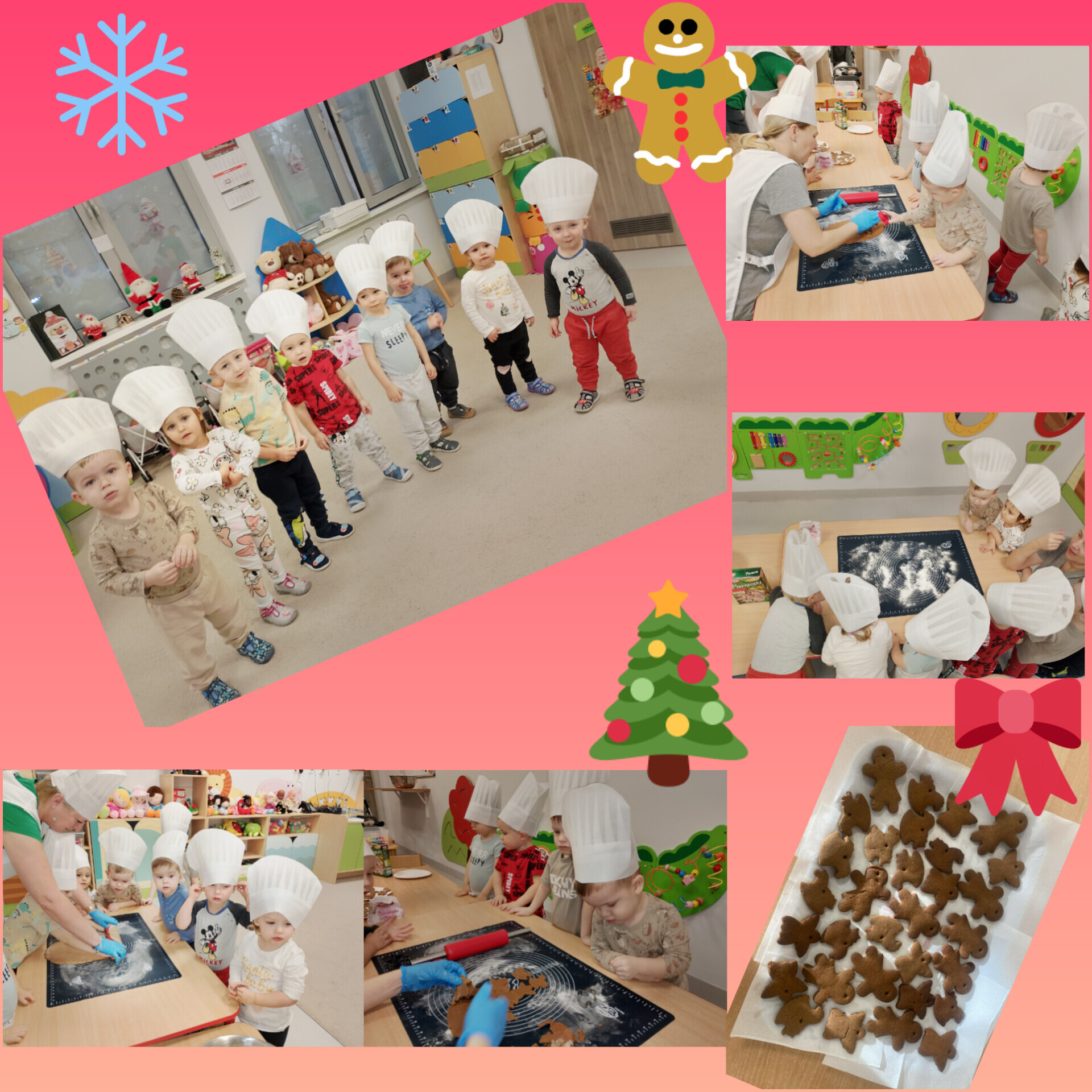 Następnie, jak prawdziwi cukiernicy, przystąpiliśmy do wałkowania przygotowanego przez nasze Panie ciasta na pierniki. Wykrawaliśmy różnorodne świąteczne kształty pierniczków. Podczas gdy my smacznie spaliśmy – nasze pierniczki zostały upieczone. Niesamowity aromat jeszcze długo unosił się w całym żłobku…