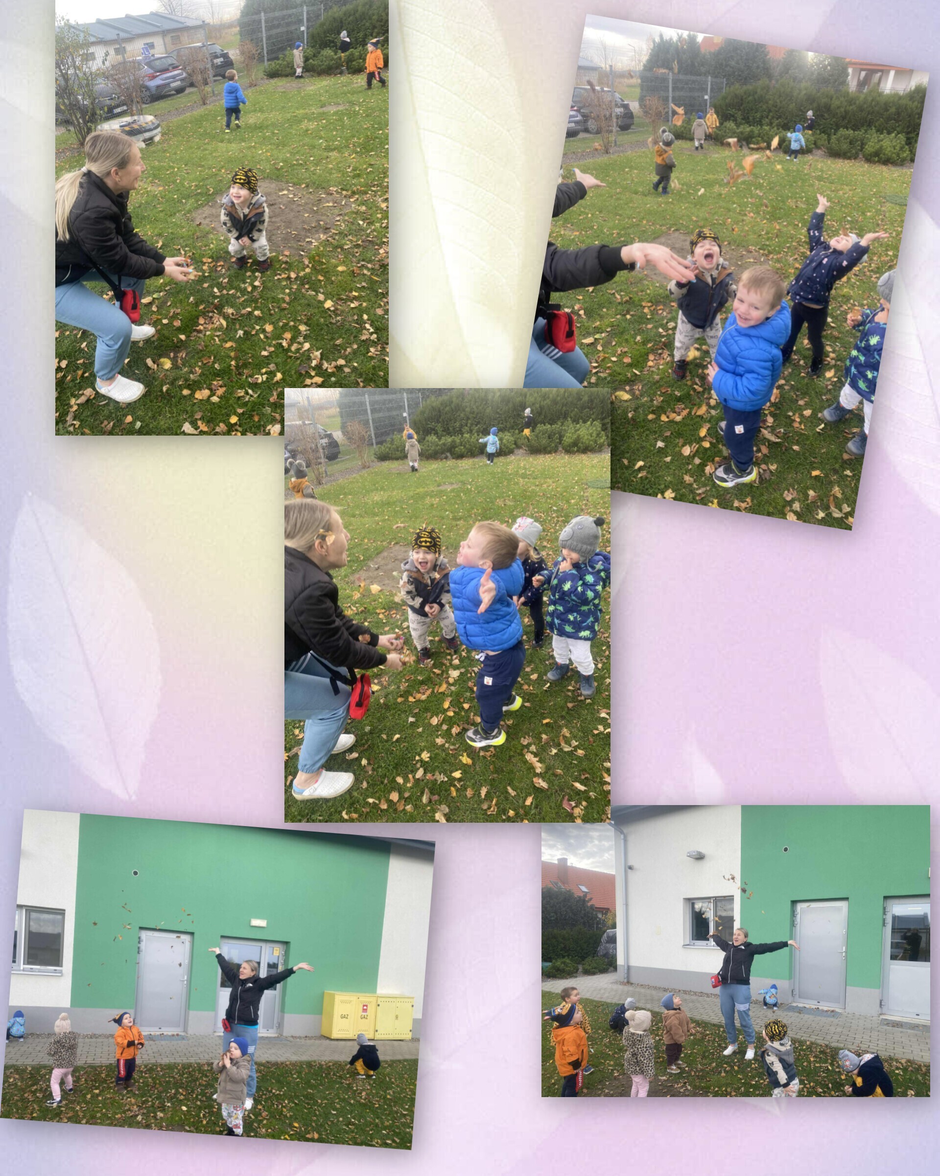 Zajęcia na świeżym powietrzu były równie ekscytujące. Dzieci miały okazję obserwować spadające liście. Była to świetna okazja, by poczuć atmosferę zmieniającej się przyrody i poznać cykl życia roślin. Cały dzień minął w radosnej atmosferze, pełnej uśmiechów i twórczej zabawy.