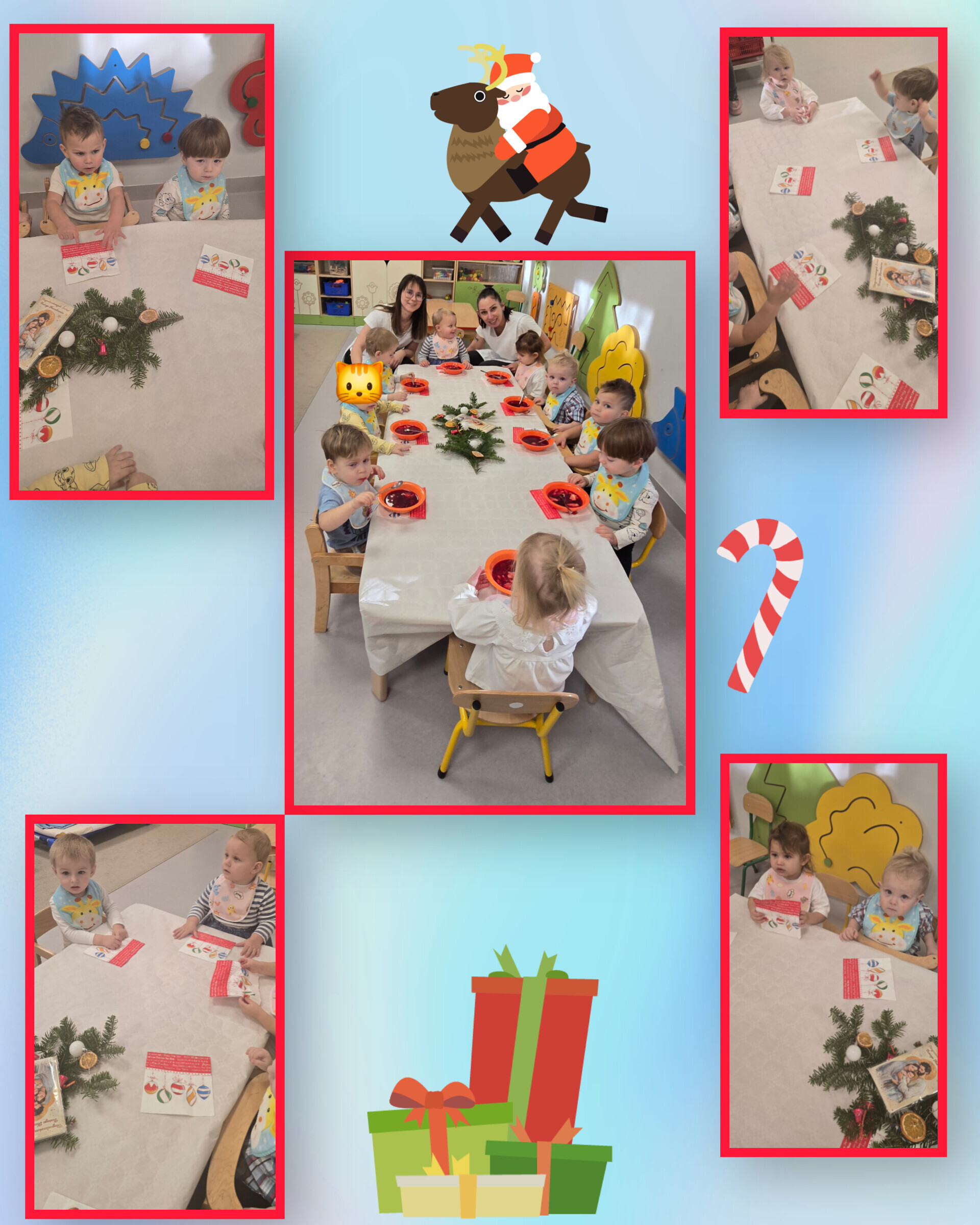 Ostatni tydzień przed świętami był w naszym żłobku pełen radości, ciepła i magicznej atmosfery. Wspólnie wykonywaliśmy świąteczne kartki dla naszych bliskich, słuchaliśmy kolęd i przygotowywaliśmy się do wyjątkowego dnia. Zwieńczeniem tego pięknego czasu była żłobkowa wigilia. Przy pięknie udekorowanych stołach, odświętnie ubrani, z uśmiechami na twarzach, delektowaliśmy się świątecznym barszczykiem oraz rybką. Był to czas pełen bliskości, serdecznych chwil i świątecznej radości.