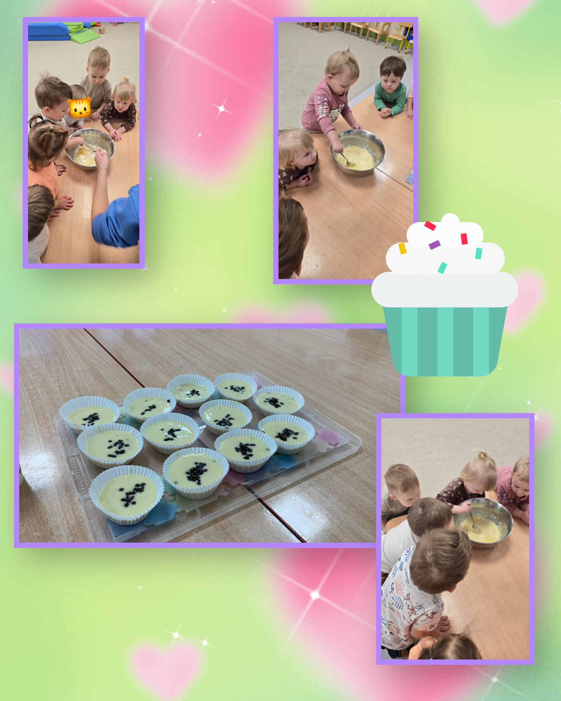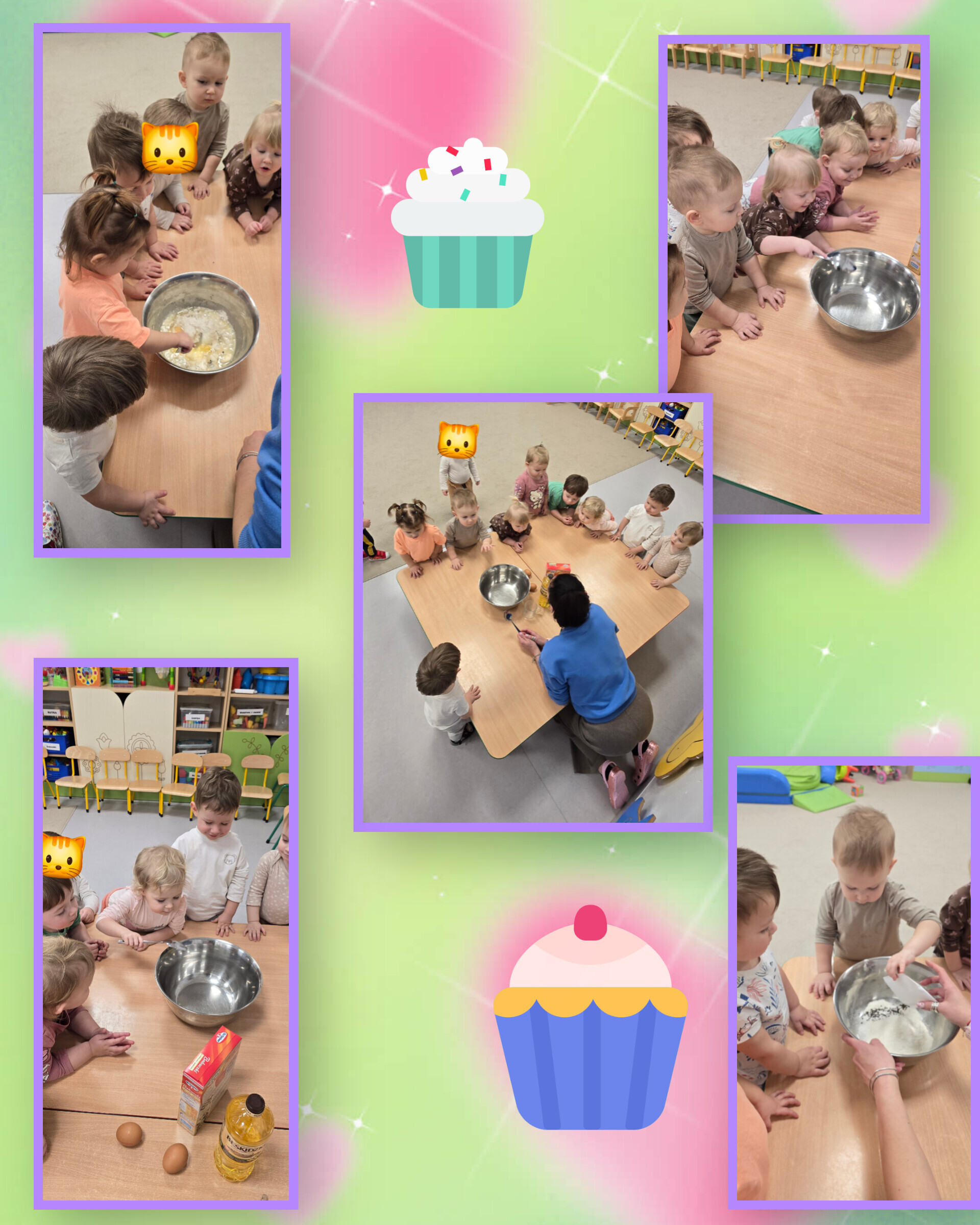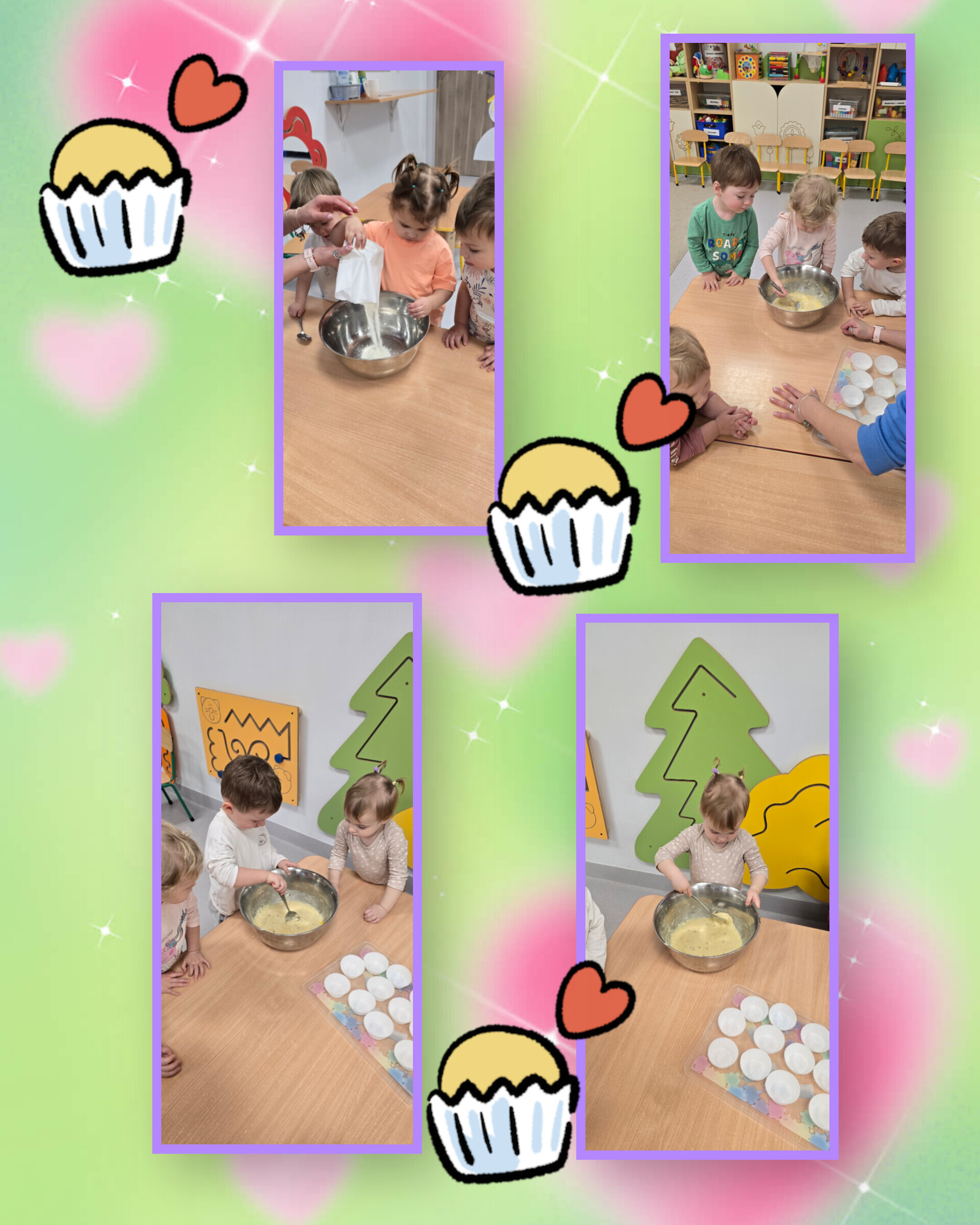 Najpierw dzielnie mieszaliśmy składniki – mąka fruwała prawie jak śnieg, a łyżki pracowały szybciej niż wyścigówki. Każdy mały cukiernik z ogromnym zaangażowaniem przygotowywał swoje babeczki. Było mieszanie, nakładanie i oczywiście… wielkie dekorowanie! Kolorowe posypki sypały się jak konfetti a babeczki z minuty na minutę stawały się prawdziwymi dziełami sztuki.