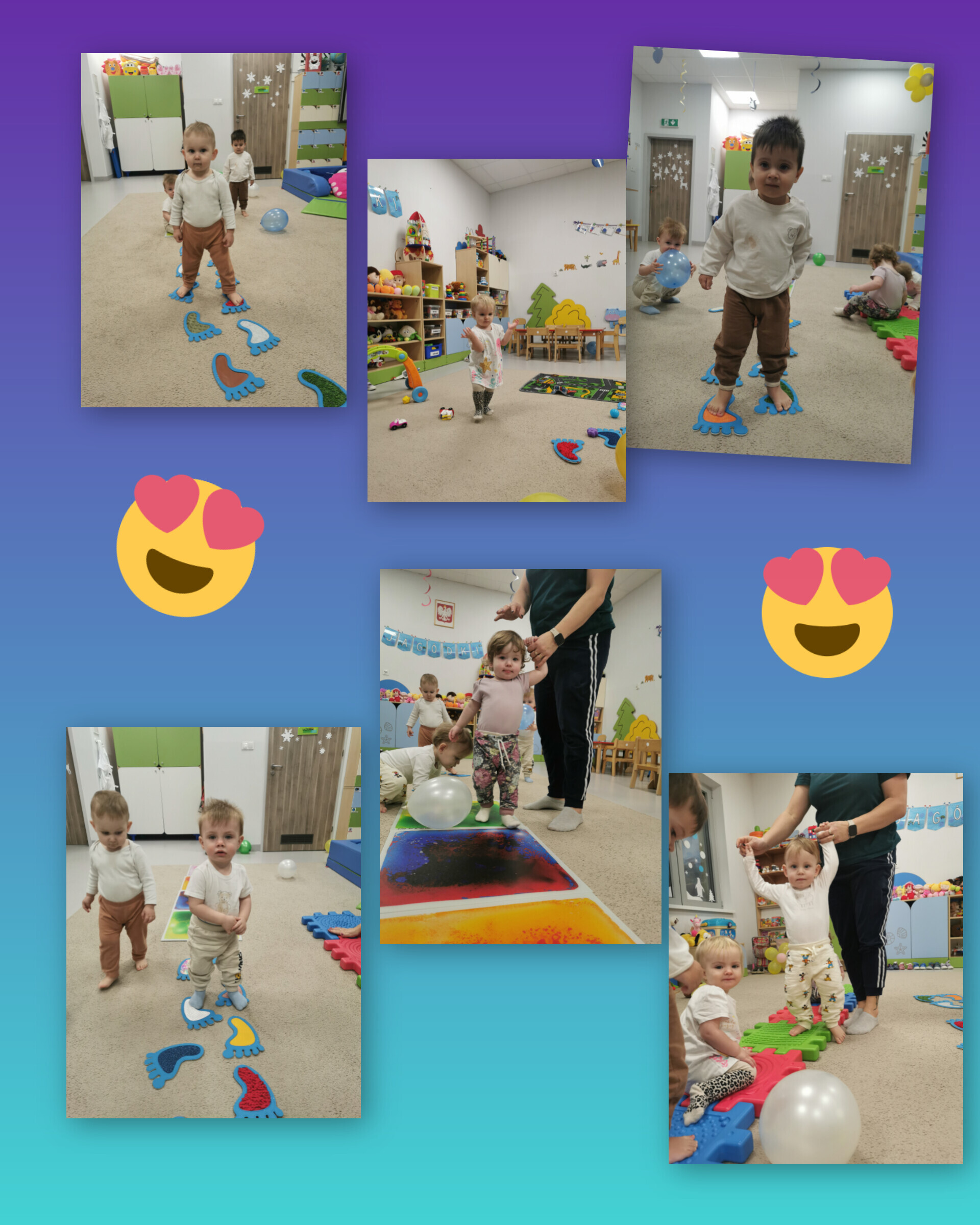 Dzięki różnorodnym bodźcom zmysłowym dziecko coraz lepiej rozumie świat wokół siebie – a przy okazji świetnie się bawi! Ścieżka sensoryczna to prawdziwa przygoda: stópki wędrują po miękkich, chropowatych i łaskoczących fakturach a całe ciało ćwiczy równowagę i koordynację. Maluszki w żłobku z ogromnym zaangażowaniem (choć czasem też z lekką niepewnością) próbowały swoich sił na różnych podłożach. Jedne śmiały się, bo coś łaskotało, inne marszczyły brwi, bo przejście okazywało się nie lada wyzwaniem. Na szczęście czujne i uśmiechnięte opiekunki dzielnie zachęcały, kibicowały i dodawały odwagi. Było dużo śmiechu, małych „ooo!” i wielkiej radości z każdego kroku naprzód!
