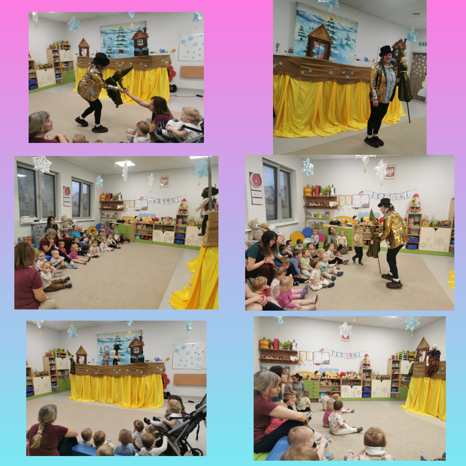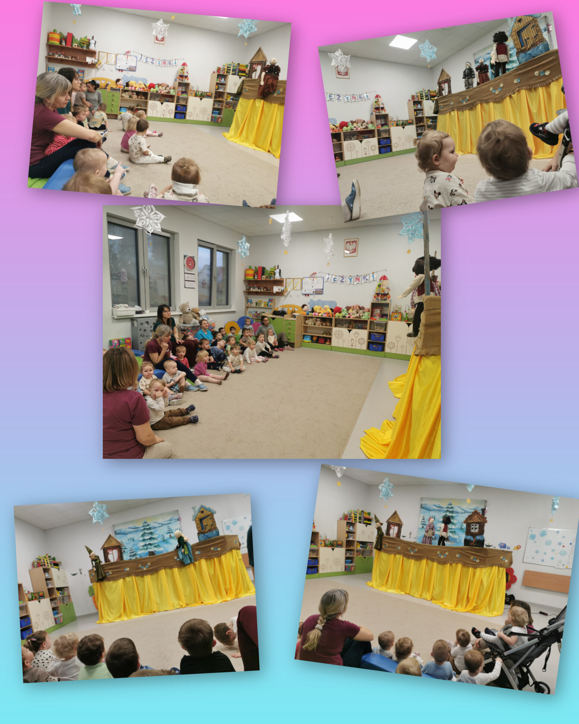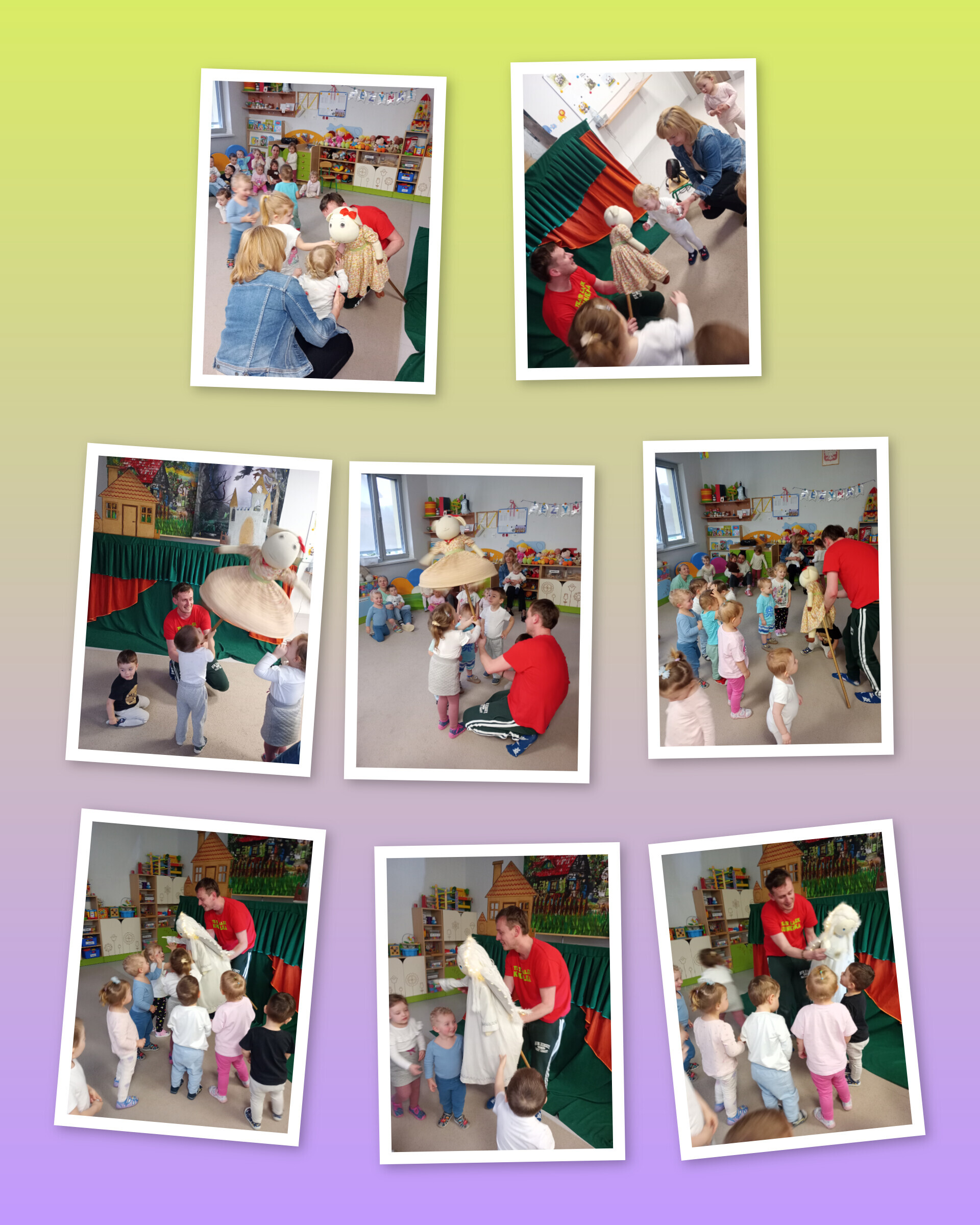 Na scenie wystąpiło aż siedem lalek (niektóre były większe od nas!), a wszystko działo się na tle pięknej, kolorowej dekoracji. Było dużo śmiechu, radości i świetnej zabawy. Dzieci patrzyły z zaciekawieniem, reagowały śmiechem przy zabawnych scenkach i z zachwytem obserwowały każdą kukiełkę, niektóre nawet podskakiwały z radości, kiedy lalka „machała” do nich rączką lub przesyłała buziaki!