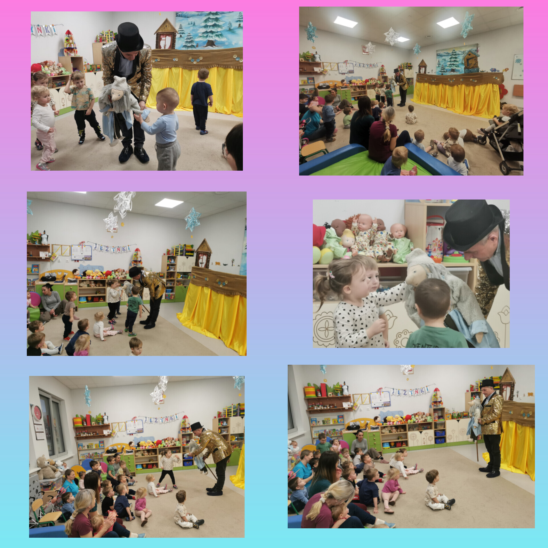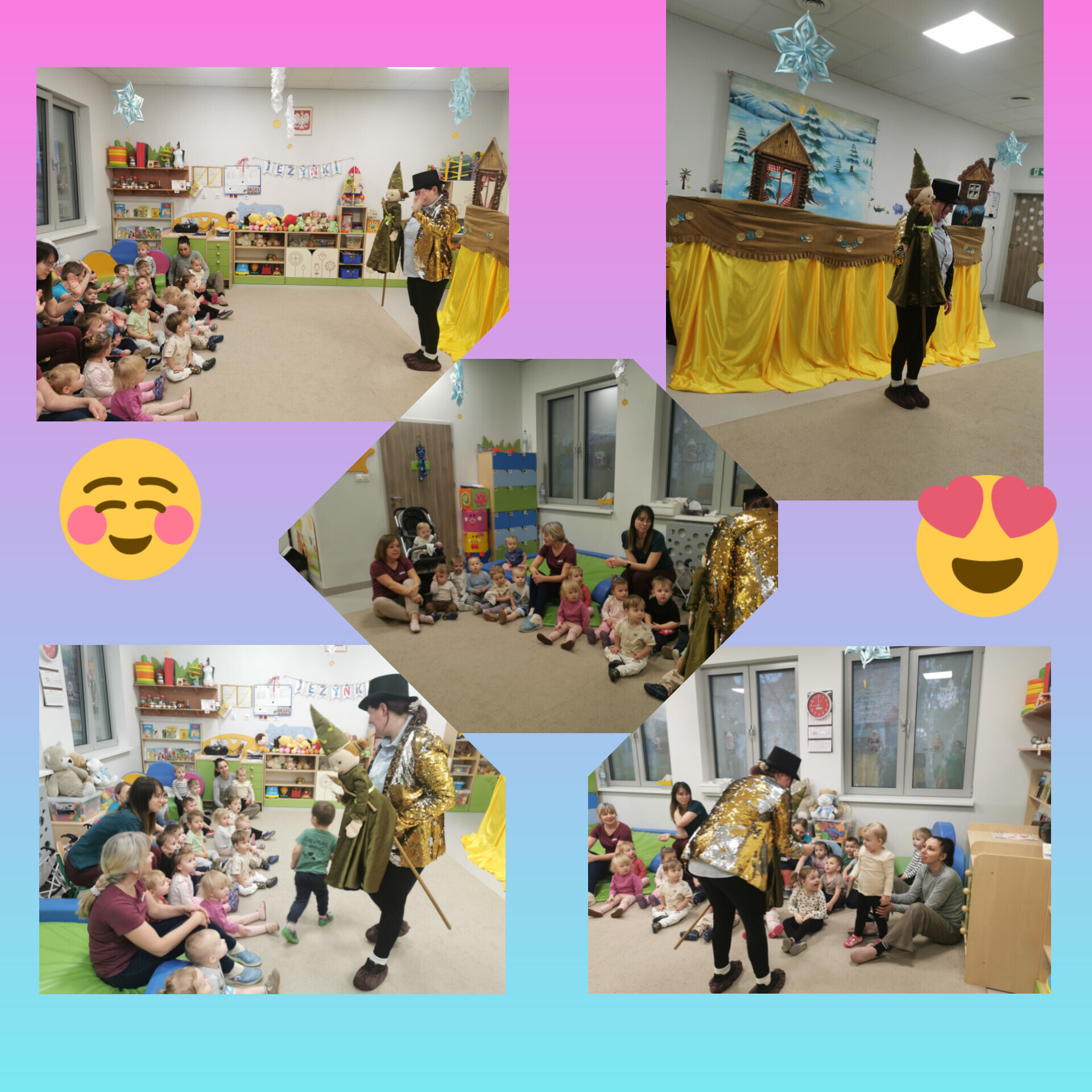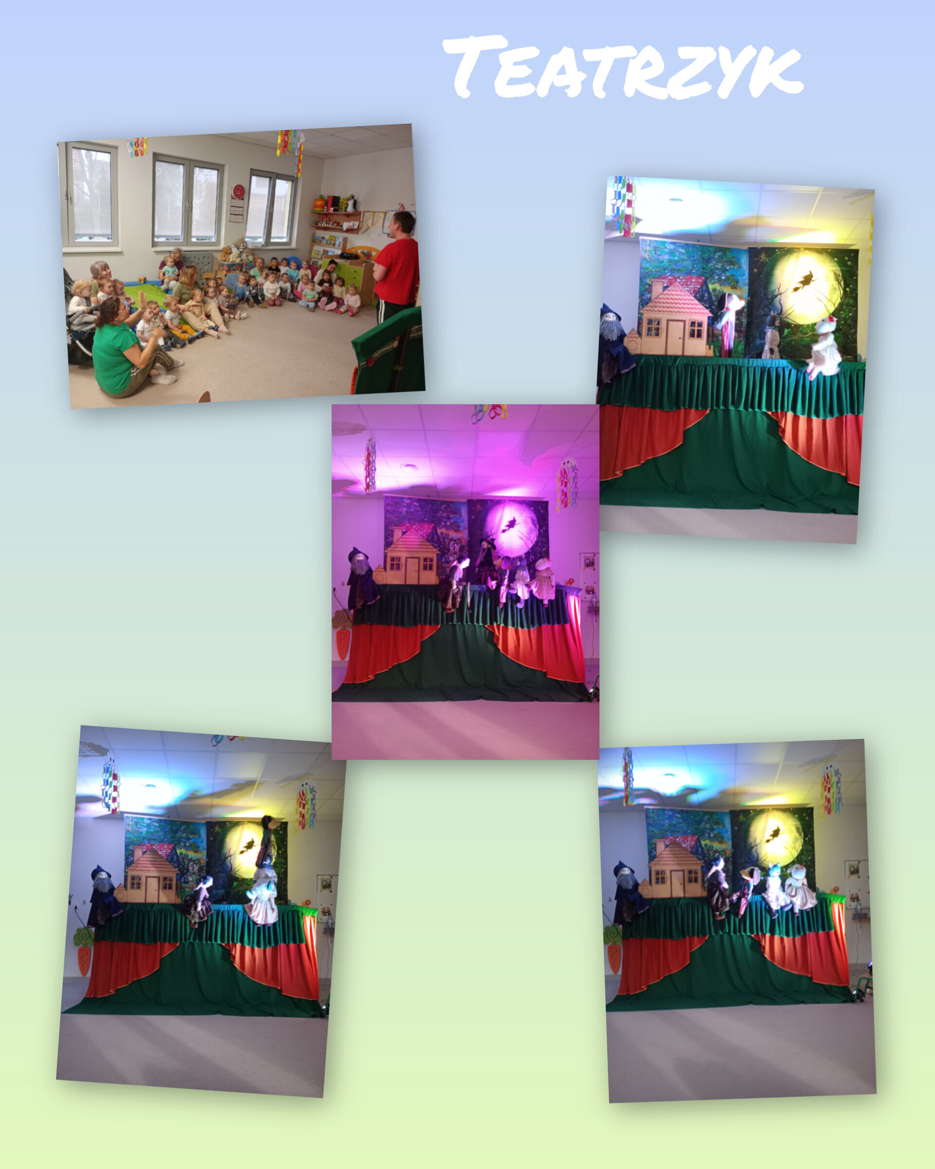 Na scenie wystąpiło aż siedem lalek (niektóre były większe od nas!), a wszystko działo się na tle pięknej, kolorowej dekoracji. Było dużo śmiechu, radości i świetnej zabawy. Dzieci patrzyły z zaciekawieniem, reagowały śmiechem przy zabawnych scenkach i z zachwytem obserwowały każdą kukiełkę, niektóre nawet podskakiwały z radości, kiedy lalka „machała” do nich rączką lub przesyłała buziaki!