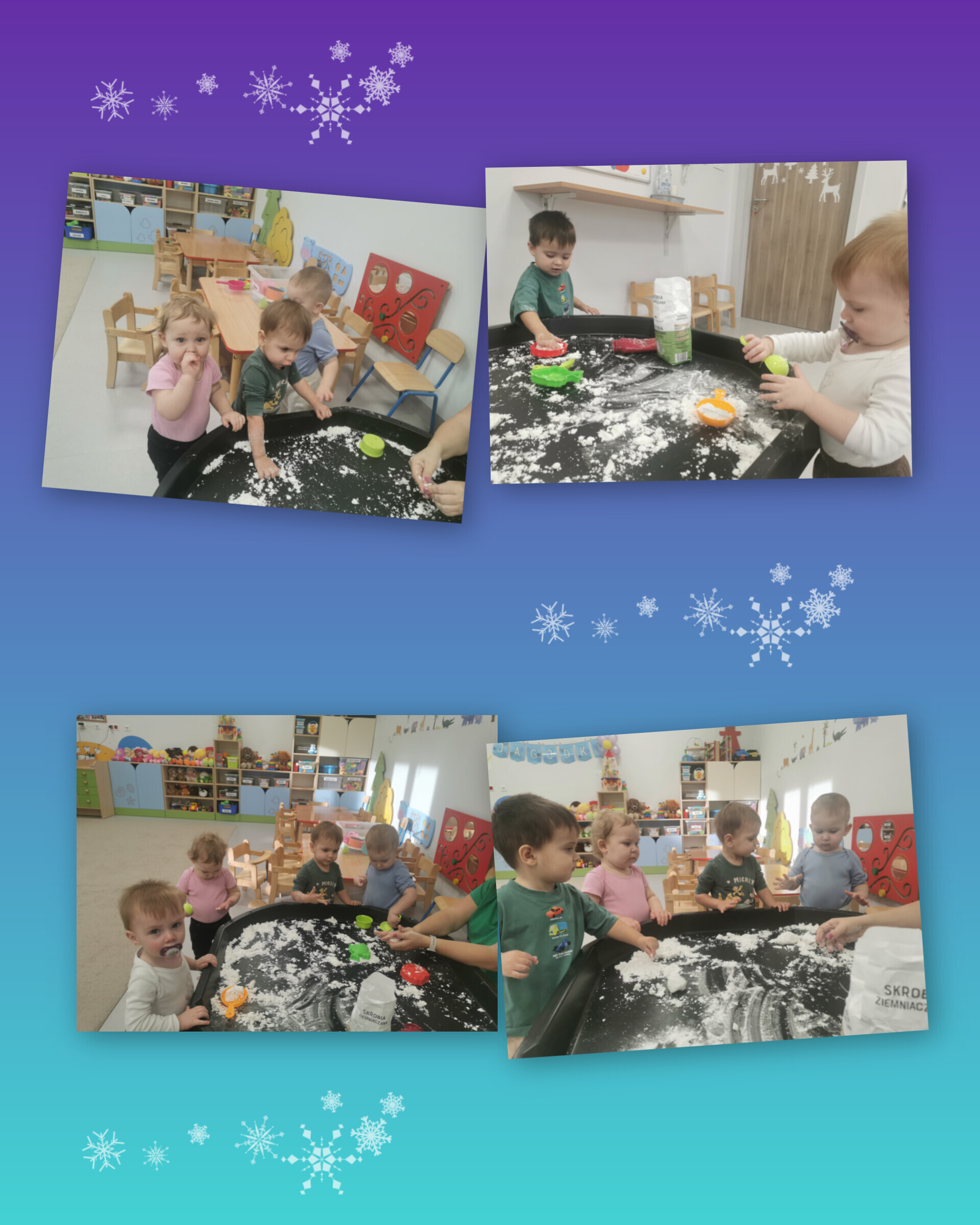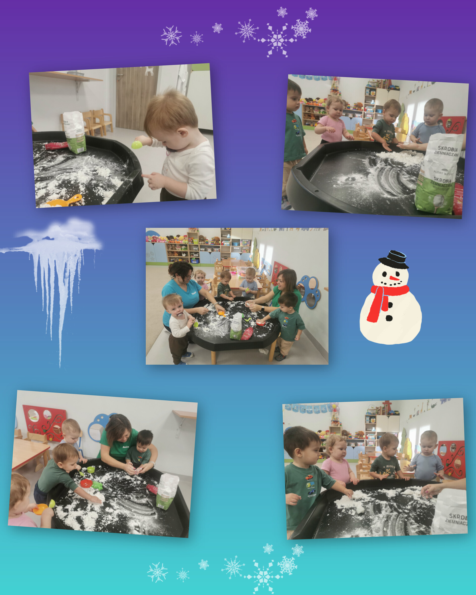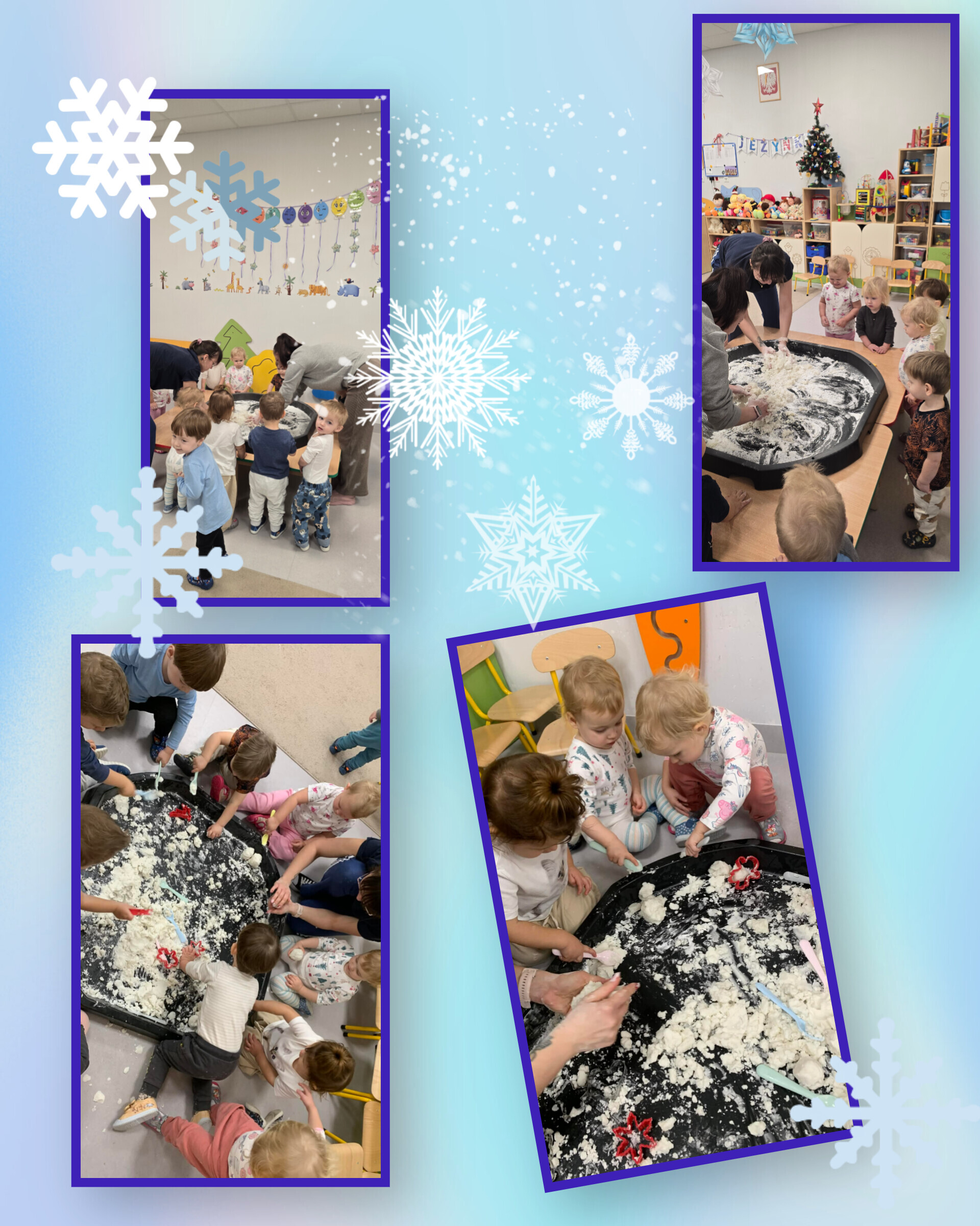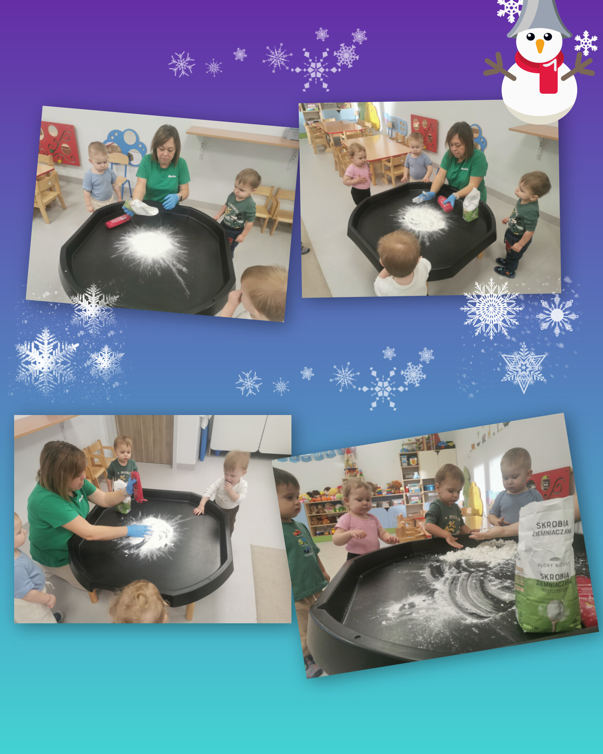 Grudzień niestety nie jest dla nas łaskawy i ani razu nie „sypnął” śniegiem… dlatego sami przygotowaliśmy jego substytut – mąka ziemniaczana i olej poszły w ruch. Taki „śnieg” chrupał i chrzęścił pod palcami, a do tego świetnie nadawał się do lepienia różnych śnieżnych figurek. Zabawy było co niemiara!