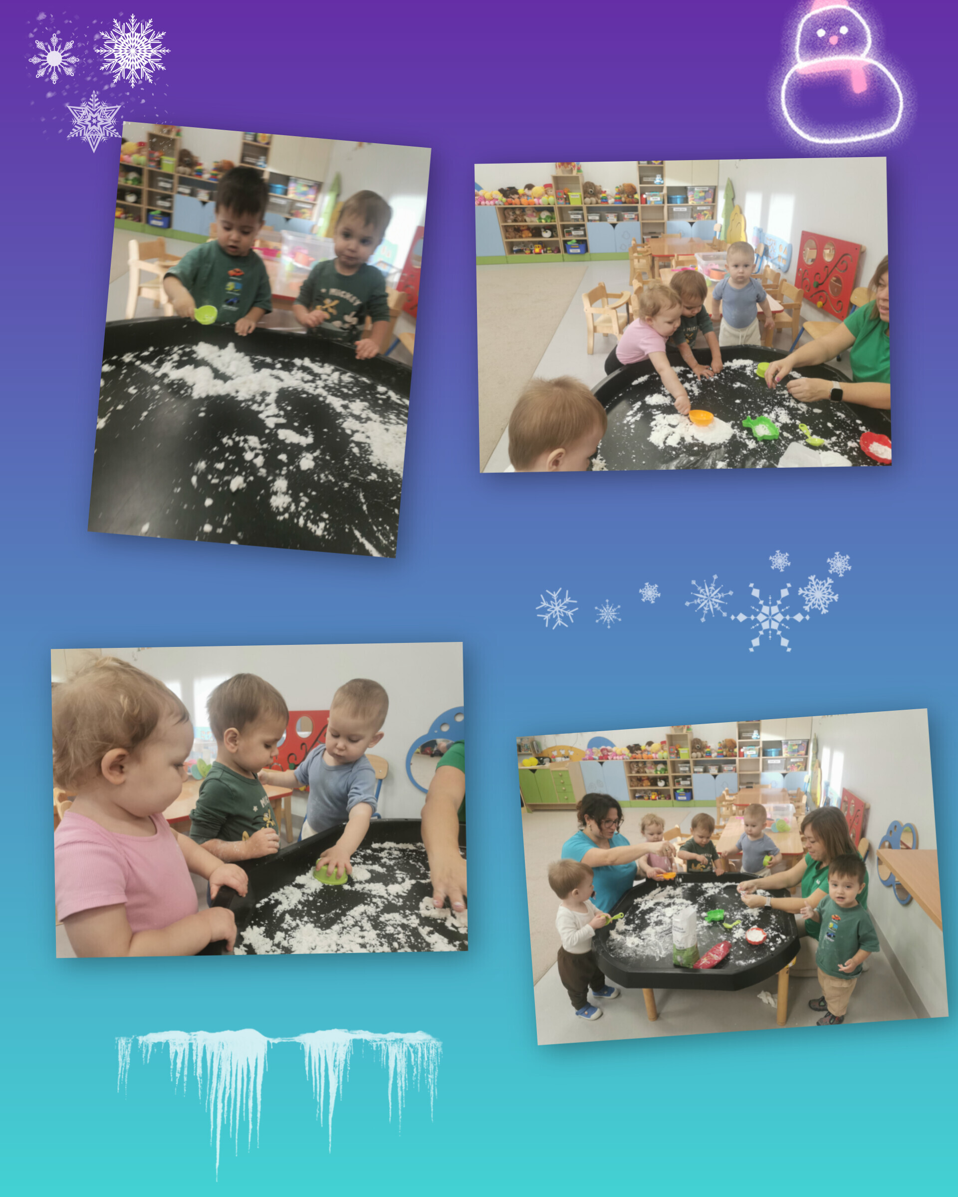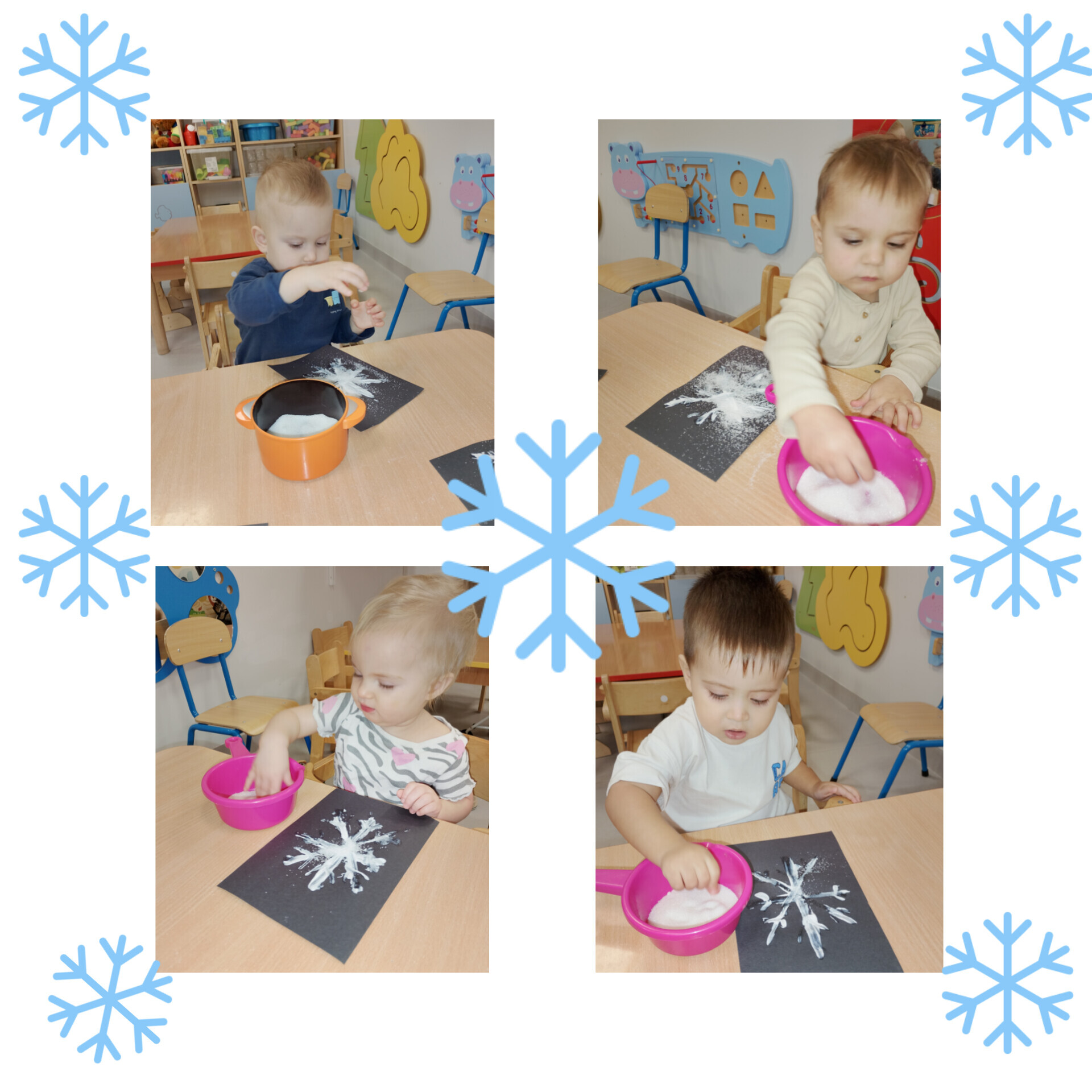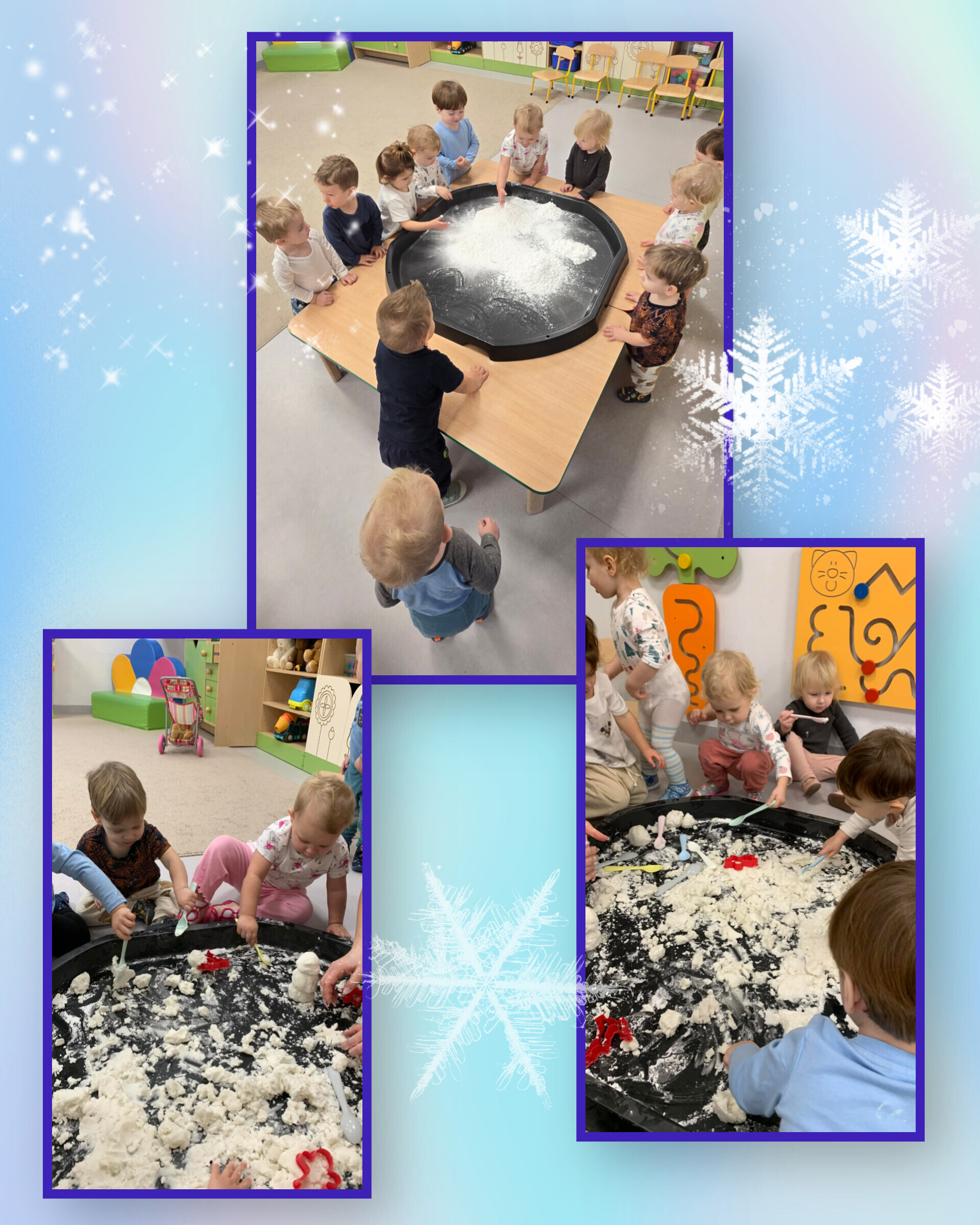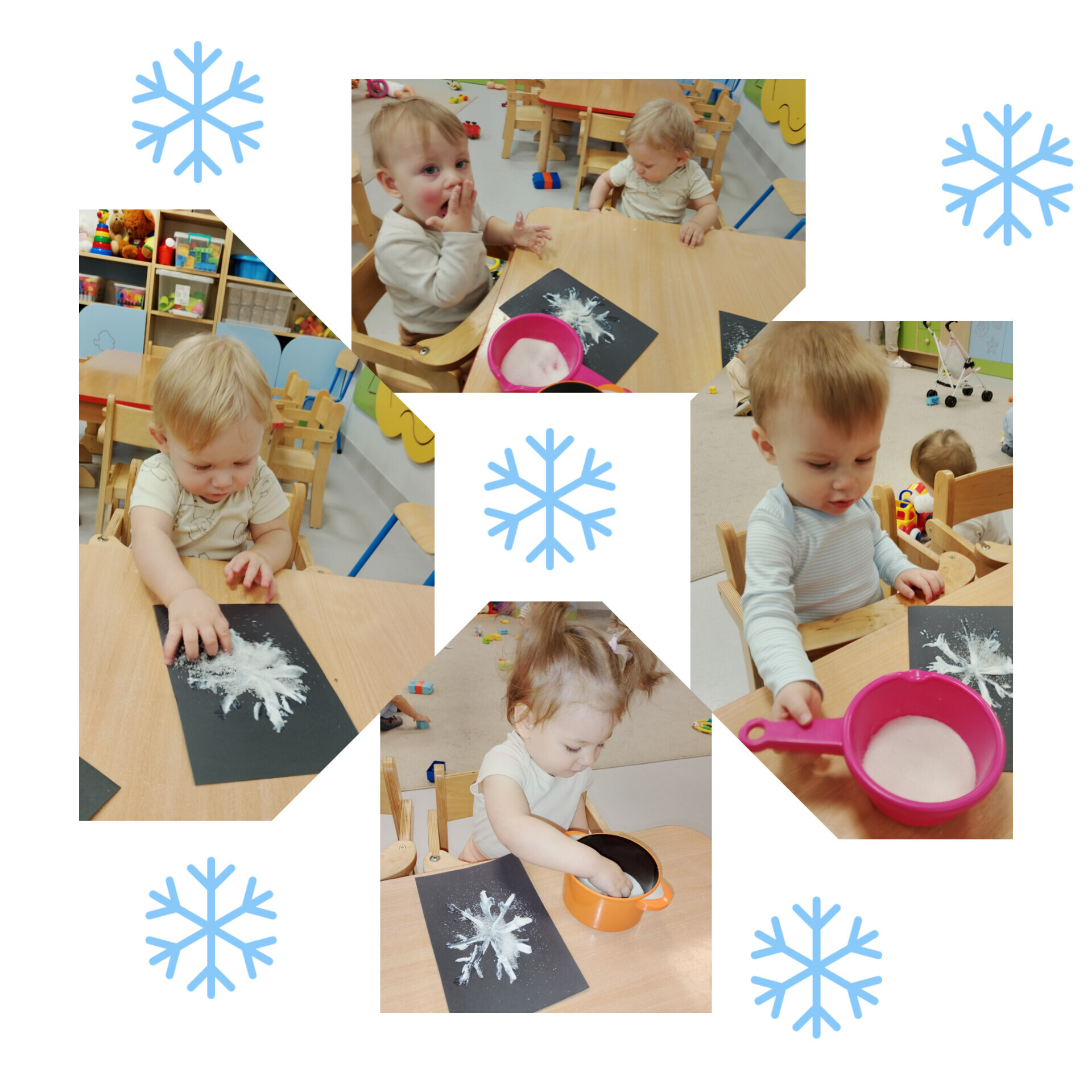 Grudzień niestety nie jest dla nas łaskawy i ani razu nie „sypnął” śniegiem… dlatego sami przygotowaliśmy jego substytut – mąka ziemniaczana i olej poszły w ruch. Taki „śnieg” chrupał i chrzęścił pod palcami, a do tego świetnie nadawał się do lepienia różnych śnieżnych figurek. Zabawy było co niemiara!