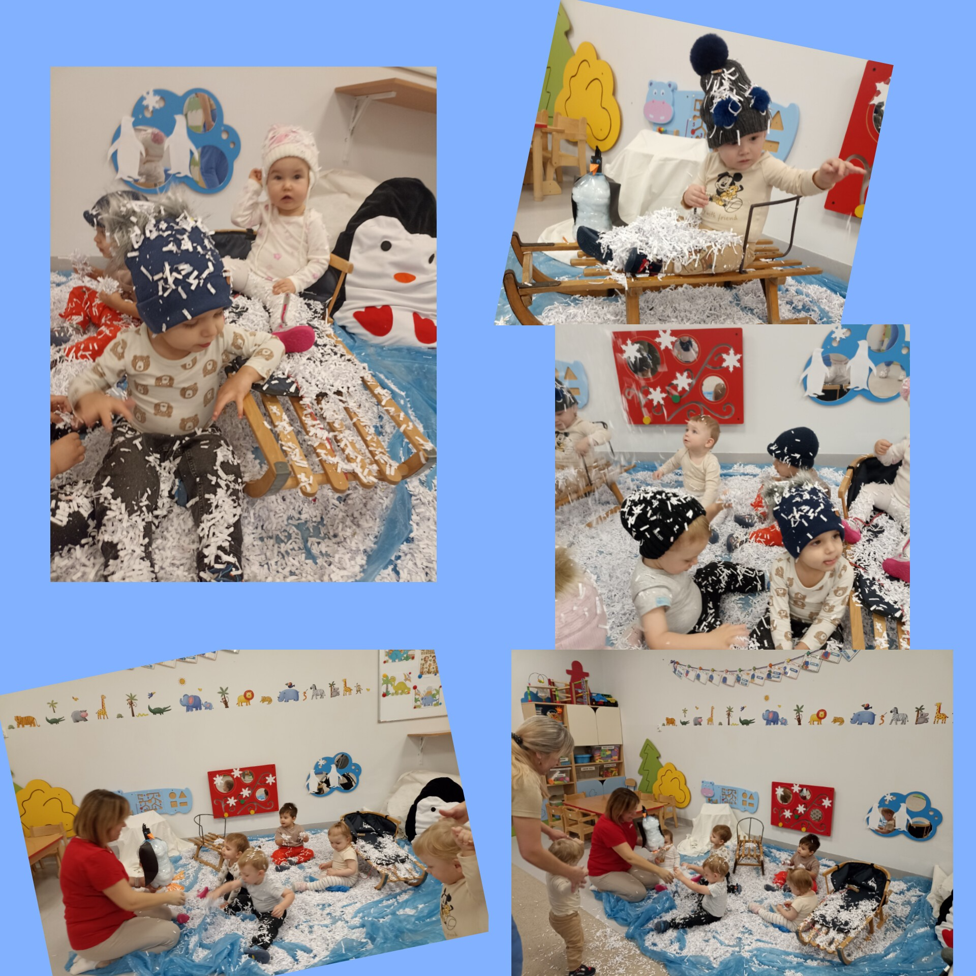 Na szczęście w naszym żłobku wszystko jest możliwe – więc… zima wróciła! I to prosto na naszą salę! Tym razem śnieg nie spadł z nieba, a wysypał się z niszczarki Pani Dyrektor. Papier dostał drugie życie, a my – pierwszorzędną śnieżycę!